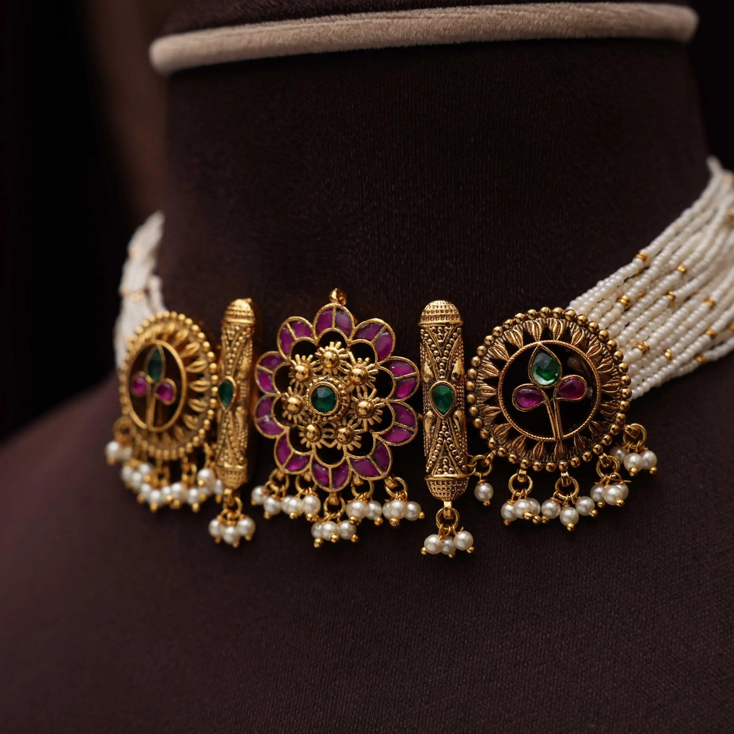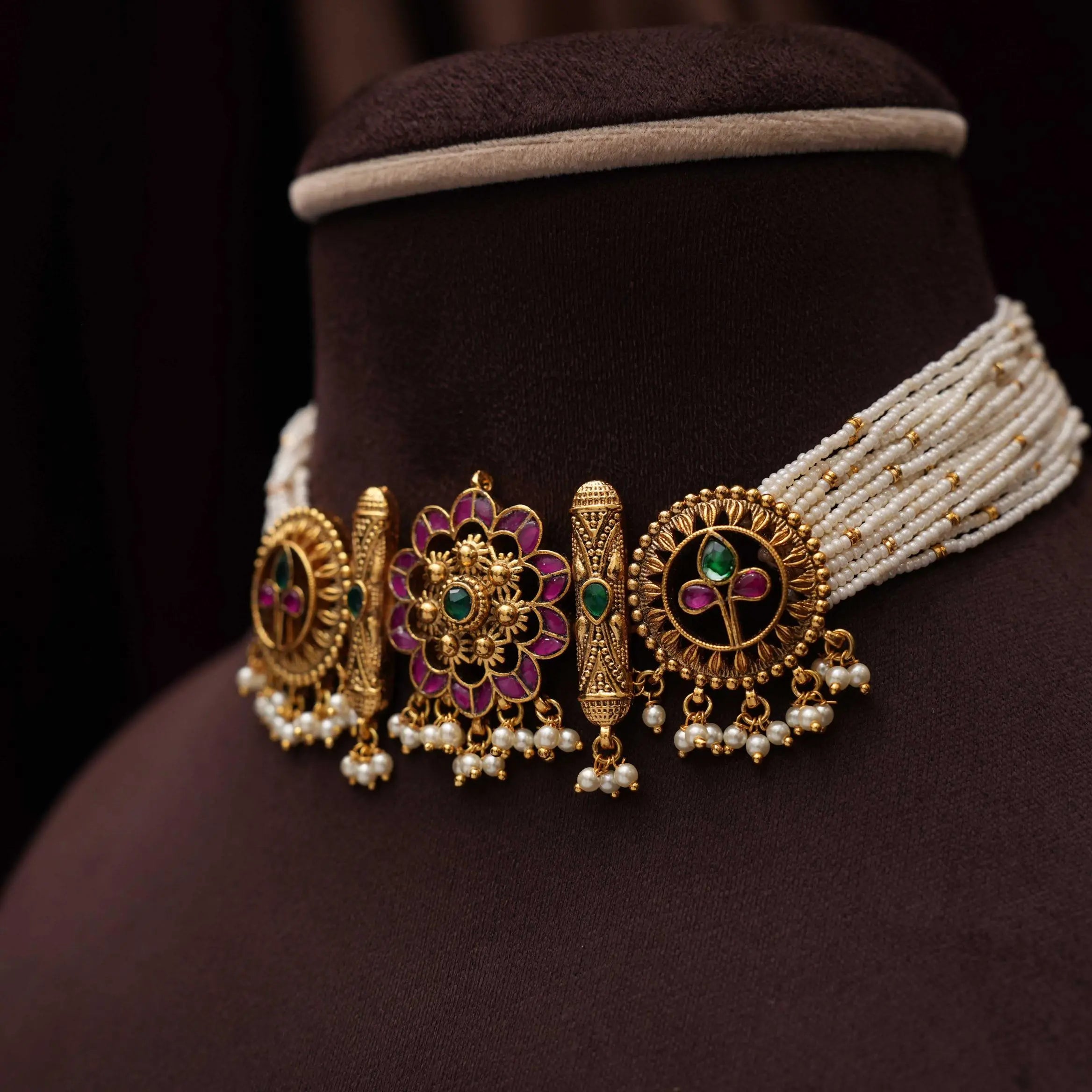 A classic choker in floral motif studded with polki stones paired to pearl chain. This set comes with a pair of earrings.