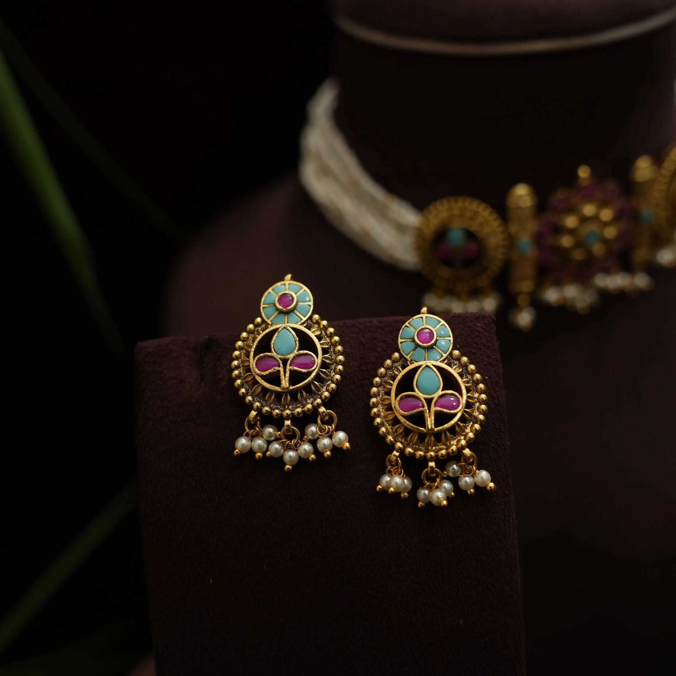 A regal choker in floral motif studded with polki stones paired to pearl chain. This set comes with a pair of earrings.