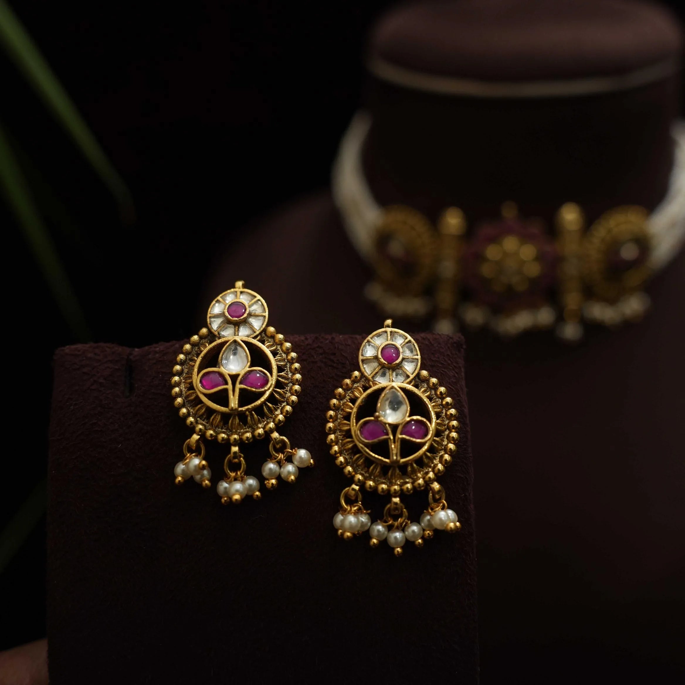 An elegant choker in floral motif studded with polki stones paired to pearl chain. This set comes with a pair of earrings.