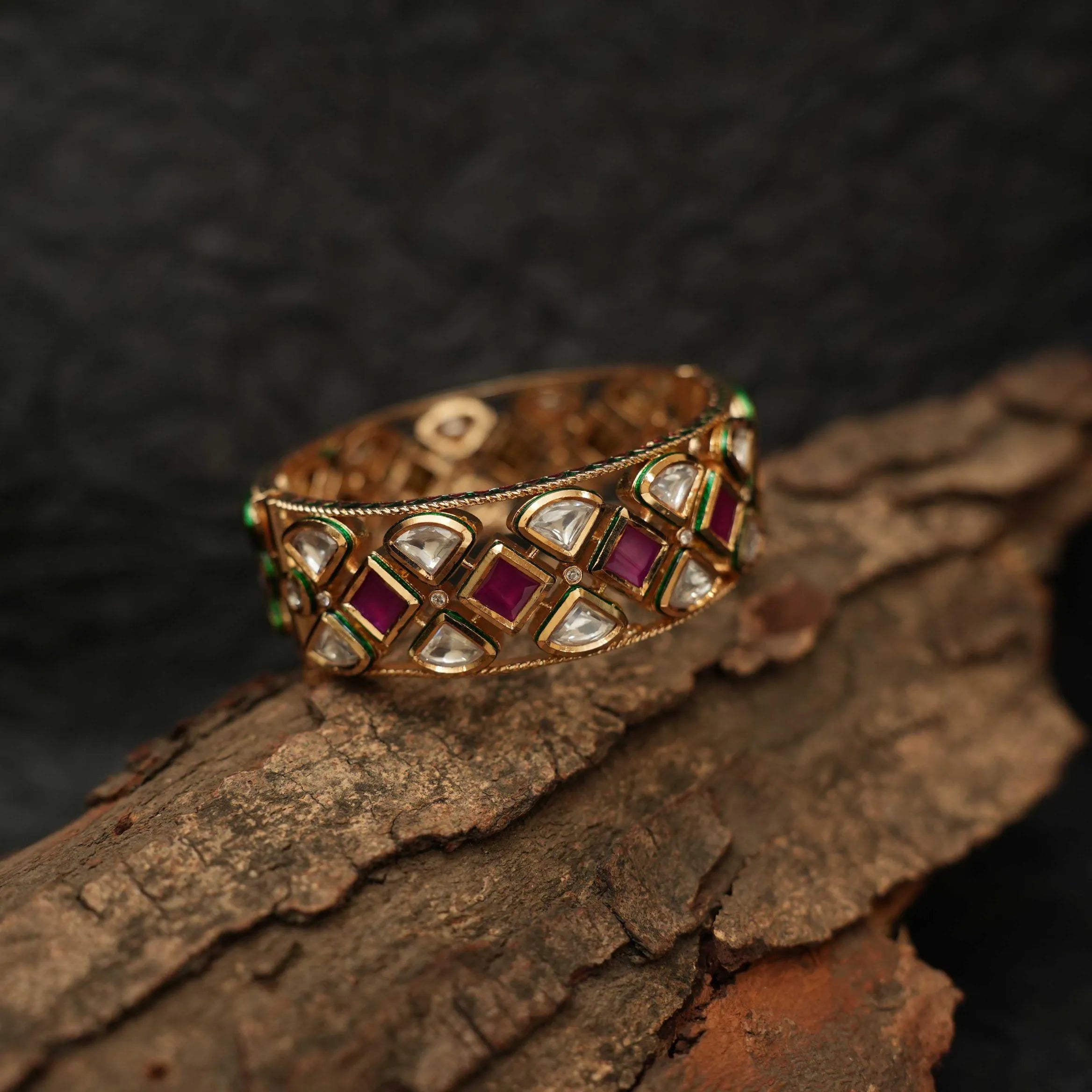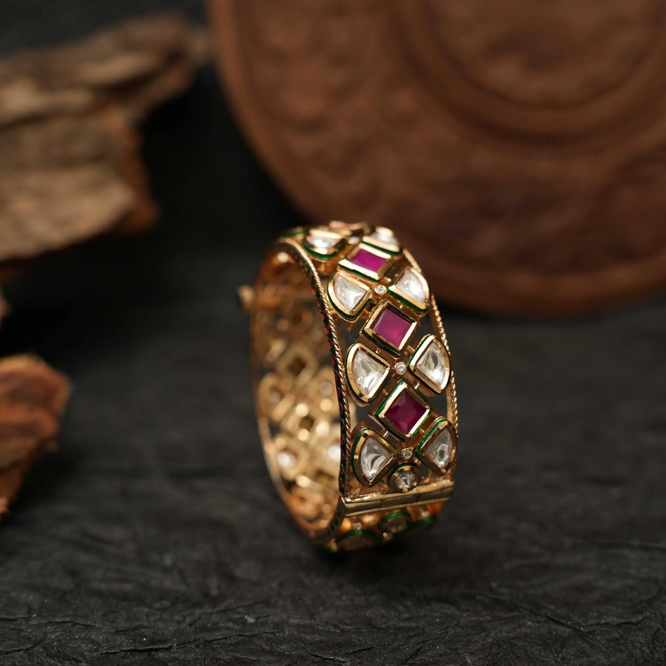 Adorn your wrists with the opulence of Kundan craftsmanship with our Kundan White & Red Bangles. These bangles feature a stunning combination of white and red stones, exuding elegance and sophistication. Perfect for adding a touch of glamour to your ensemble at weddings, festivals, and special occasions.