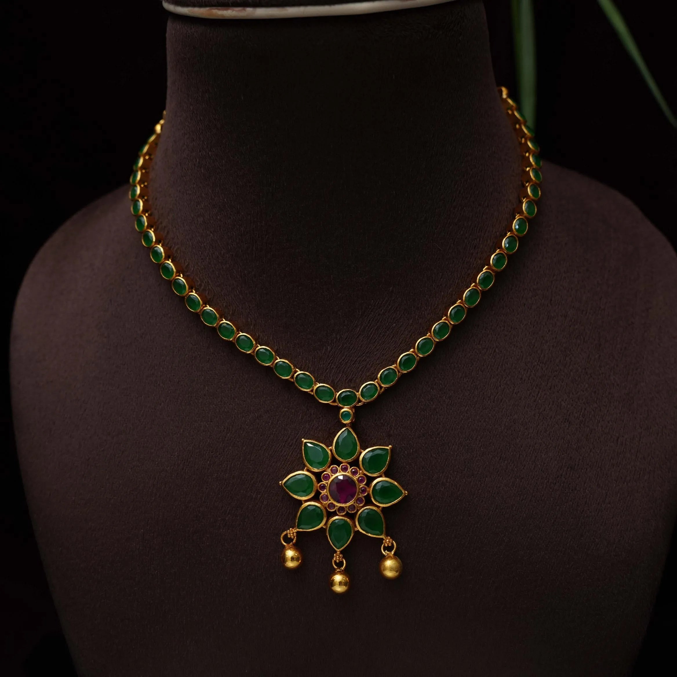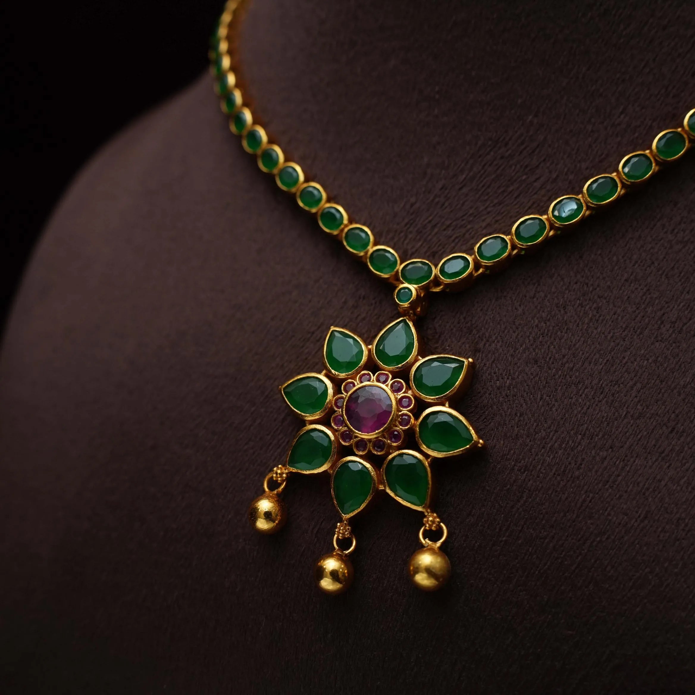 A beautiful silver necklace handcrafted with green kemp stones & golden balls. This set comes with a pair of earrings.