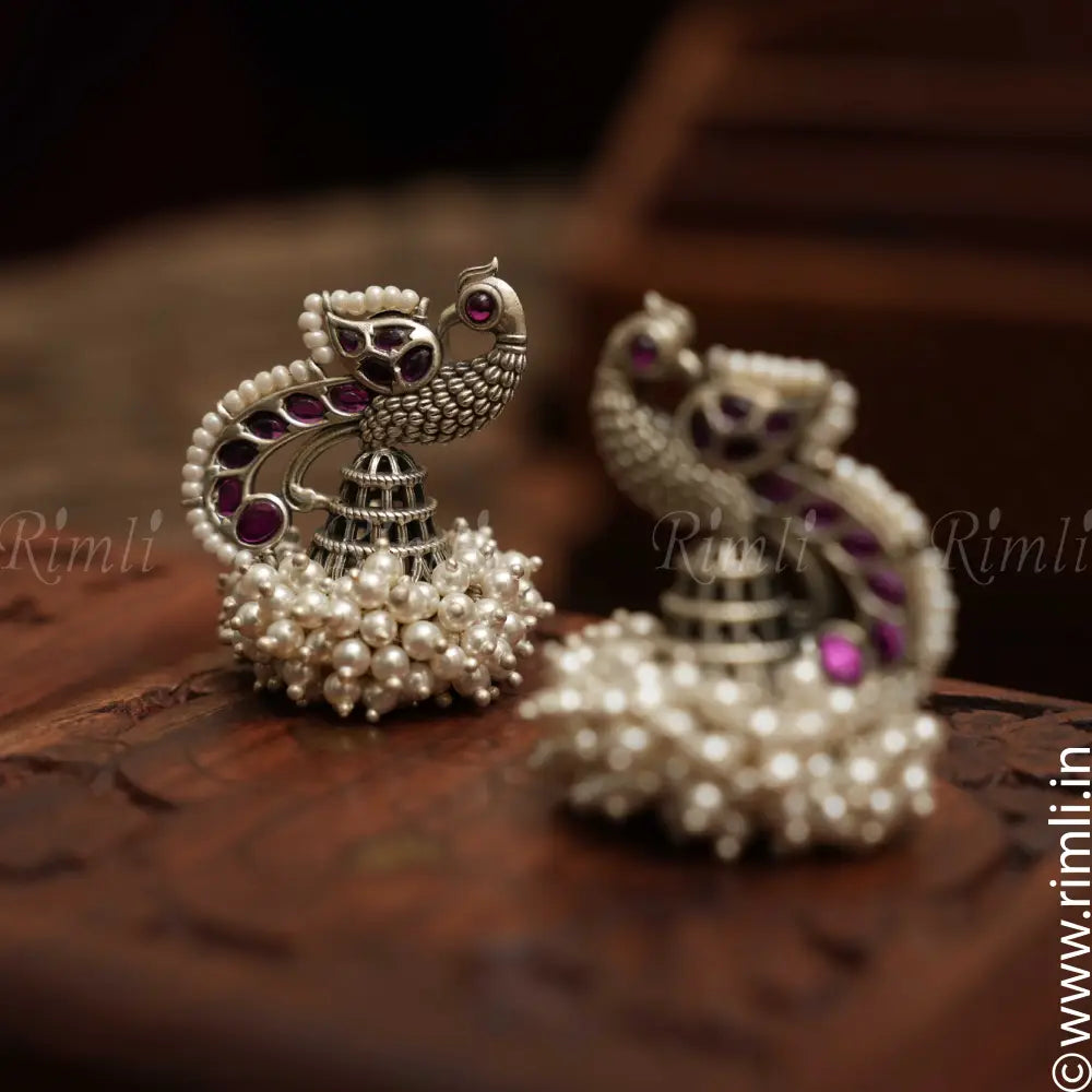 Embrace the allure of our silver jhumka, adorned with enchanting peacock motifs, vibrant kemp stones, and lustrous pearls. This beautiful accessory effortlessly combines tradition and sophistication.