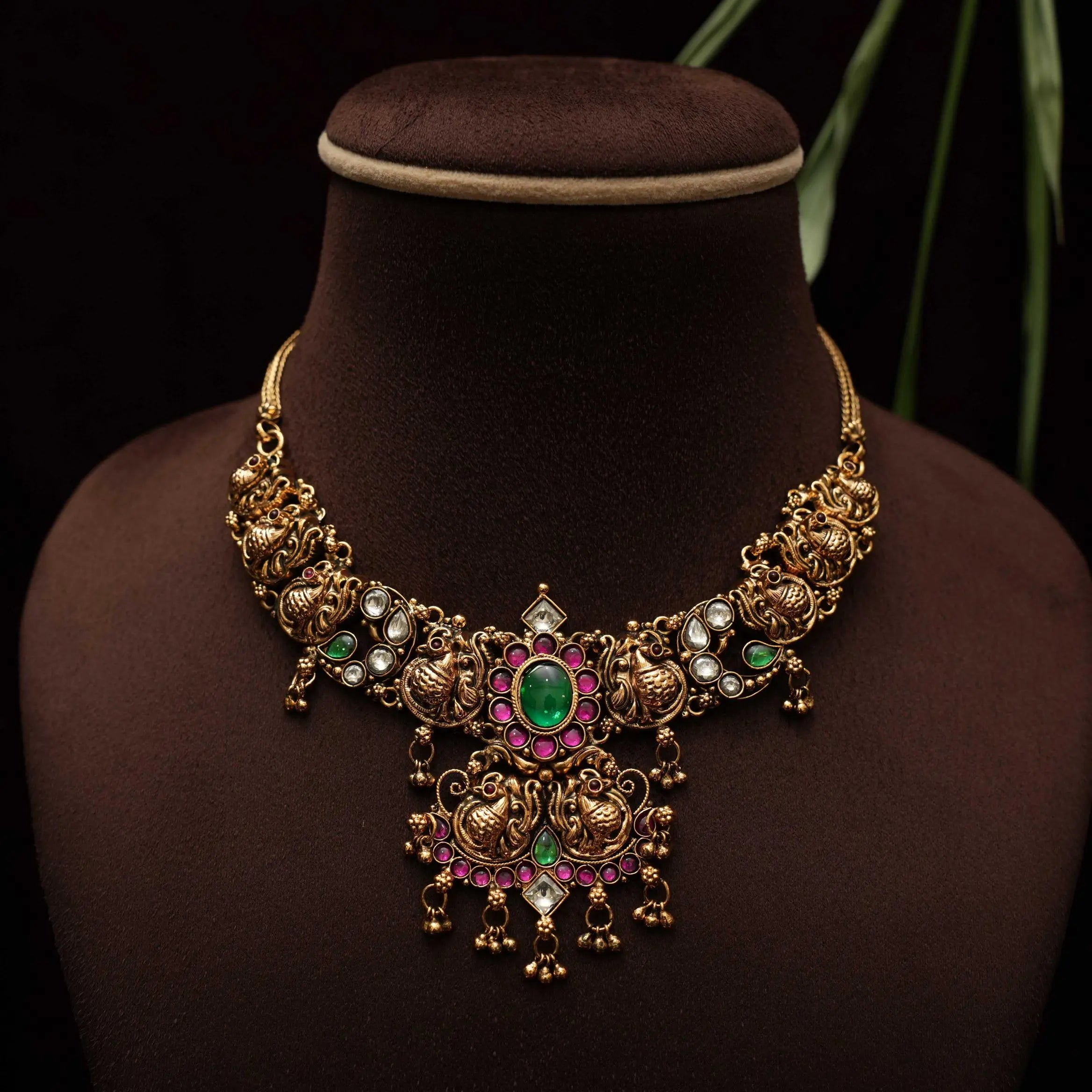 Make a statement with this exquisite antique necklace, meticulously handcrafted in traditional floral and peacock motifs. Studded with vibrant Kemp stones and adorned with delicate golden ball accents, the piece is beautifully finished in classic Nagas style, showcasing timeless craftsmanship.