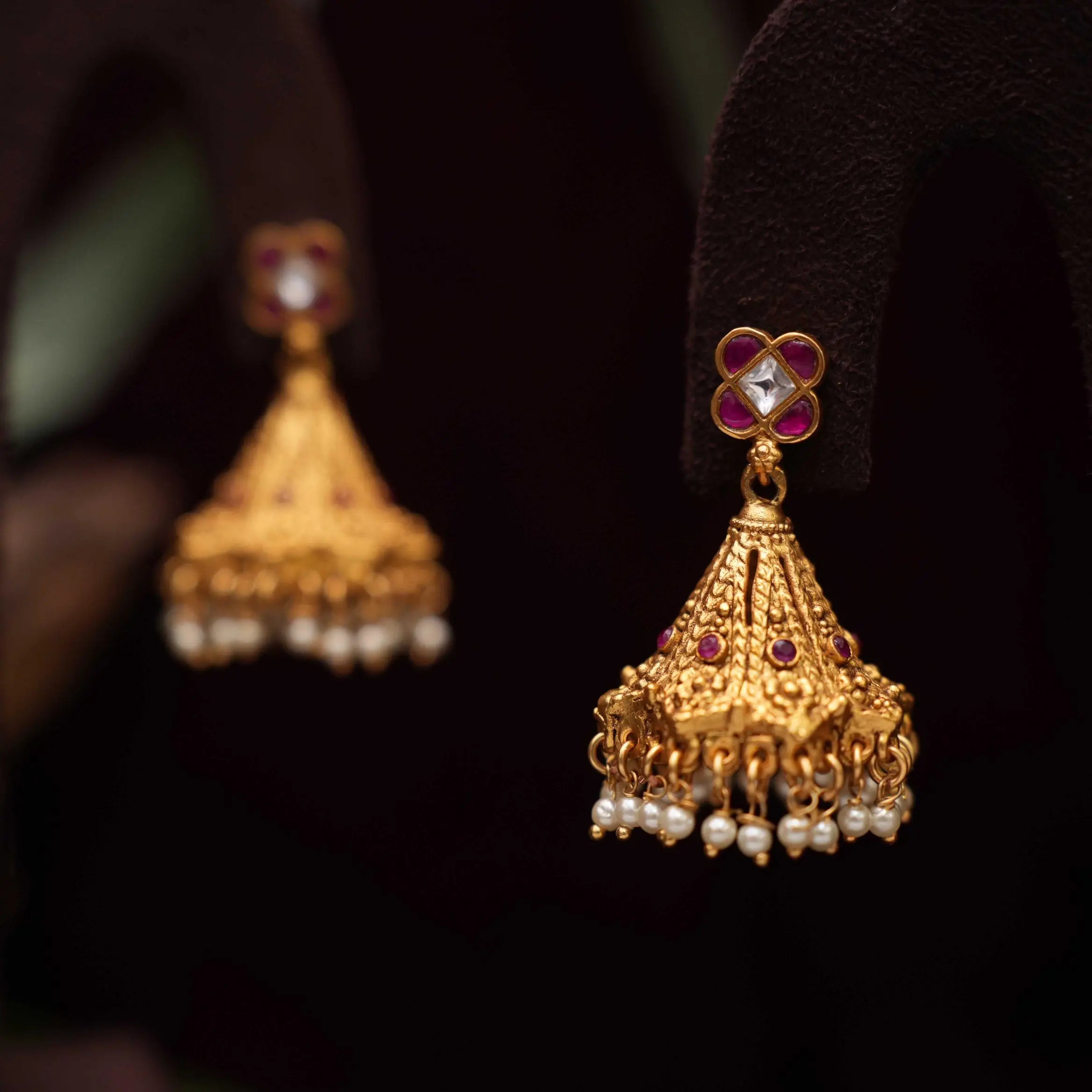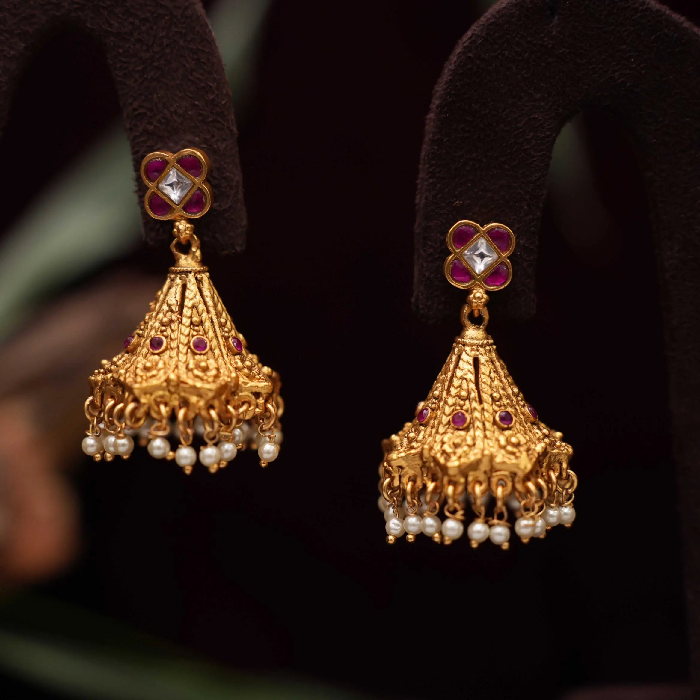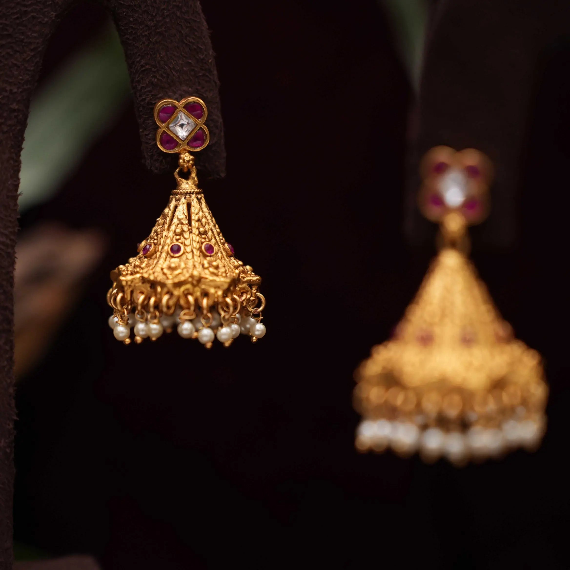 A regal antique jhumka earrings in floral motif studded with kemp stones adorn by pearls.