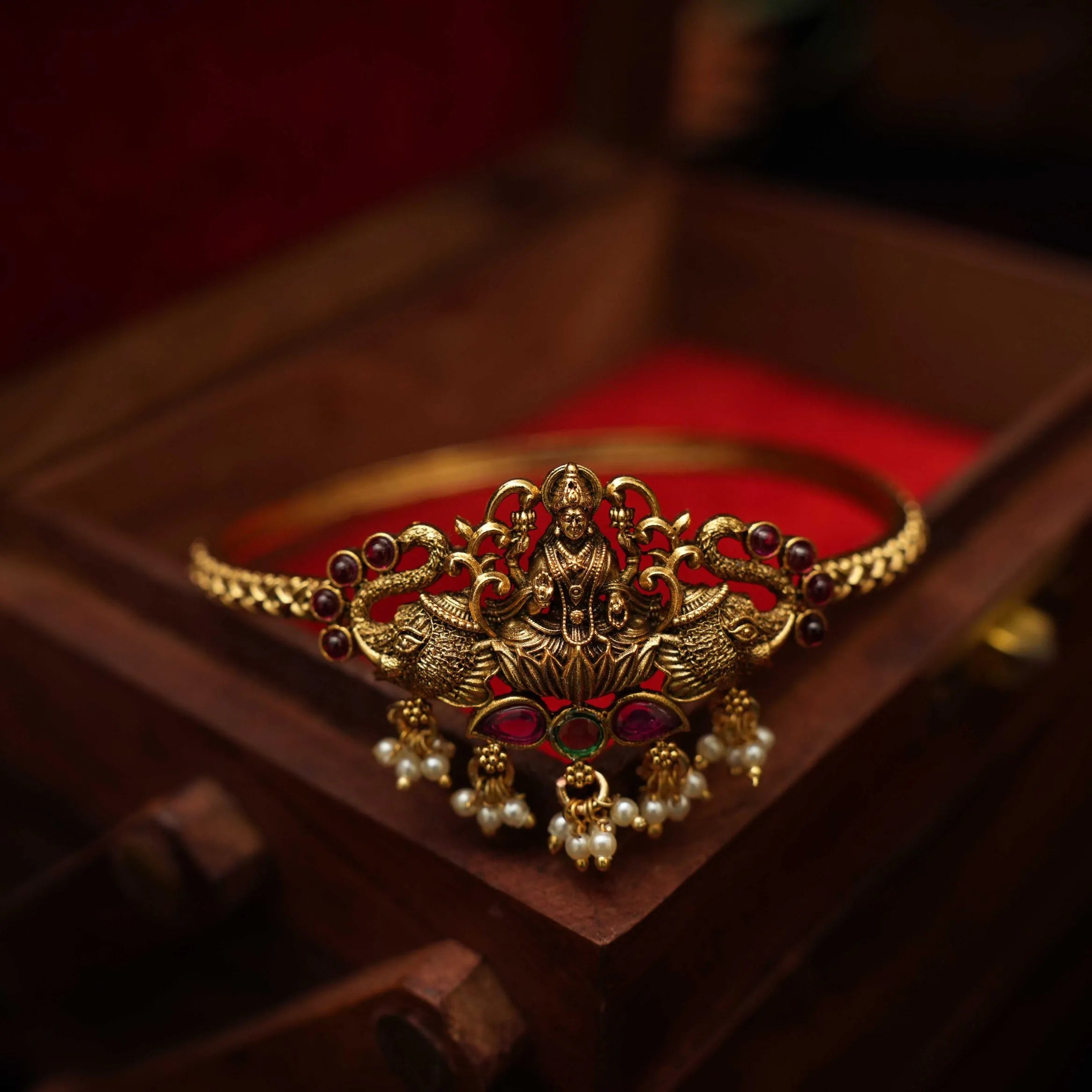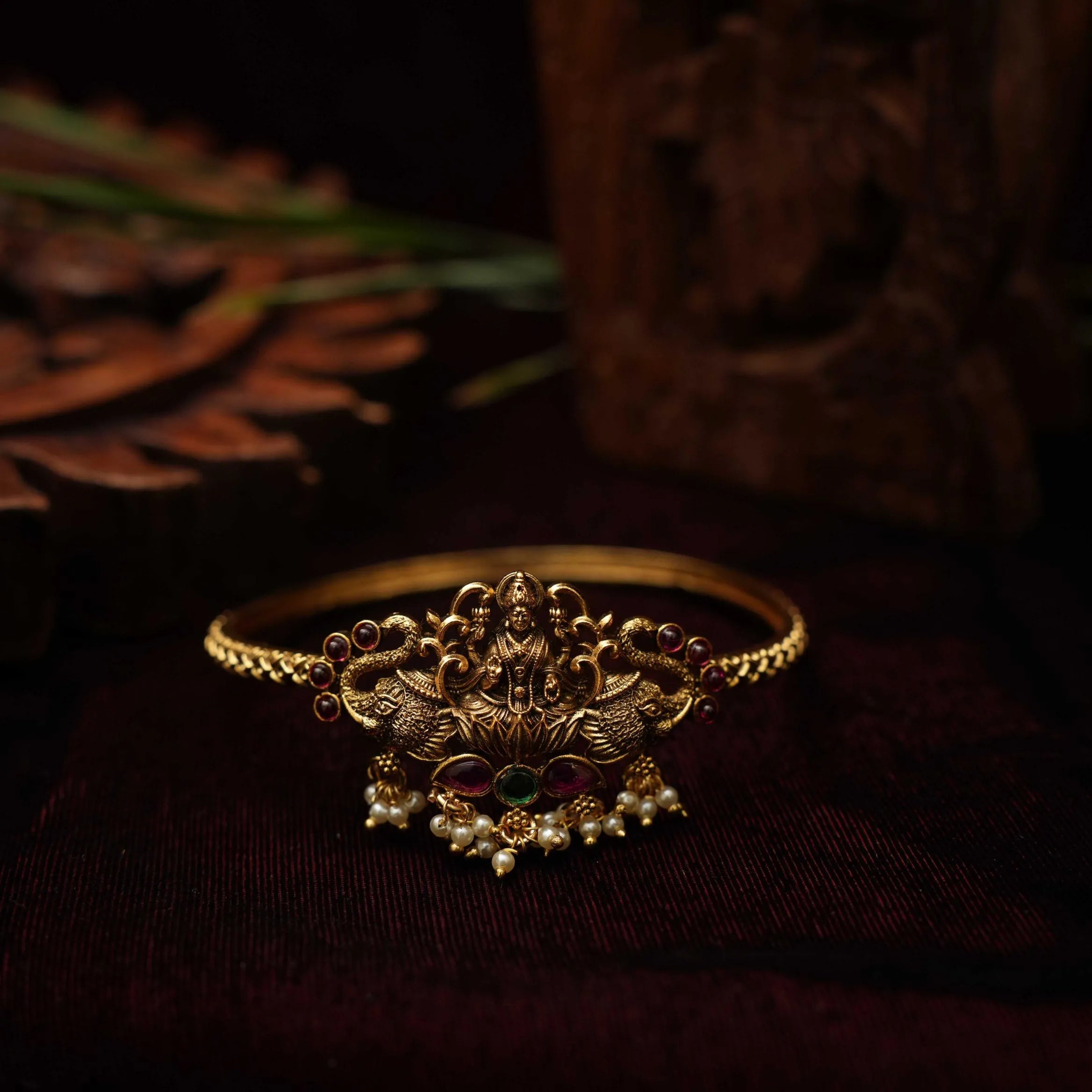 A single traditional antique bangle in Goddess Lakshmi Motif adorn with pearls.