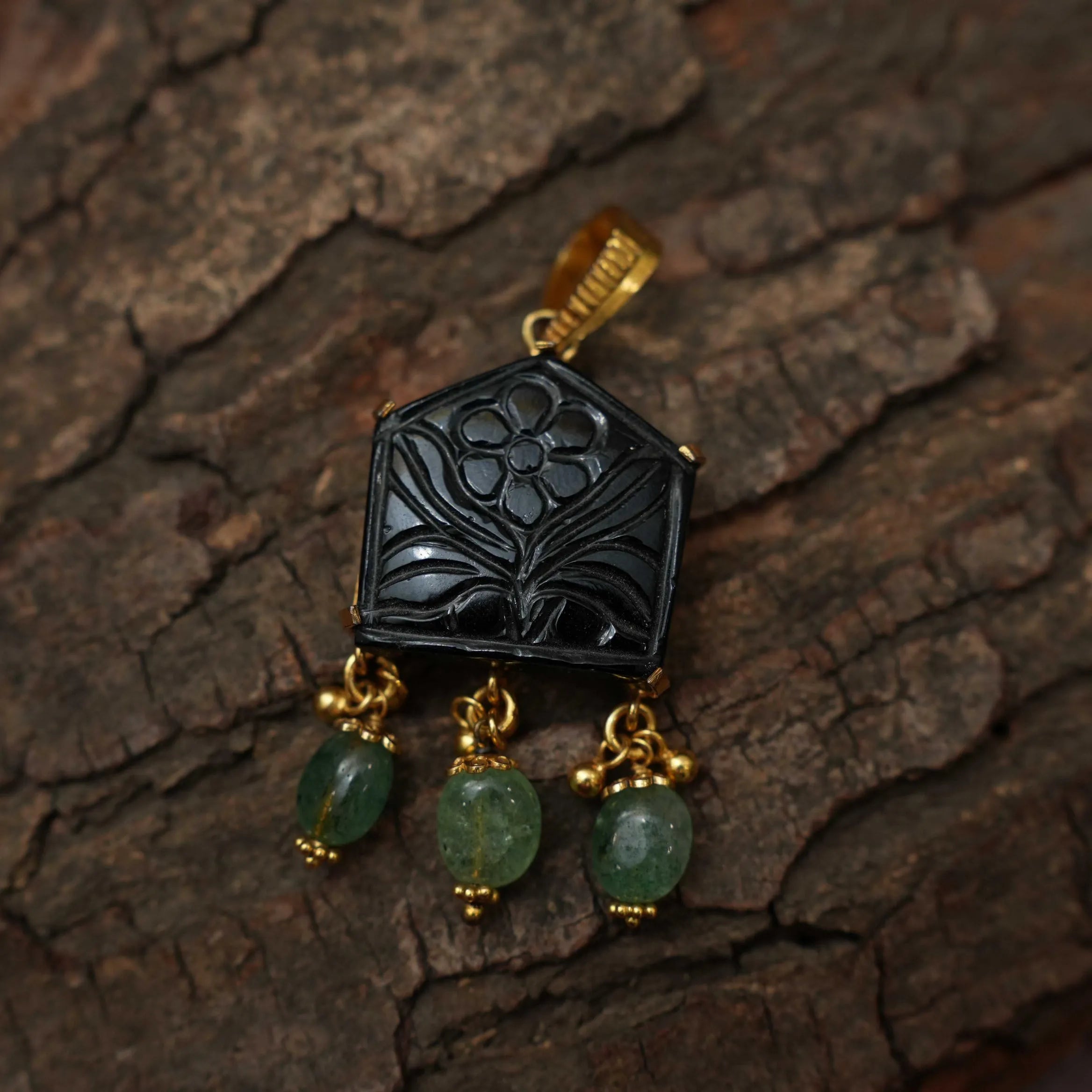 A designer silver pendant in geometric shape studded with black agate stone and beads.