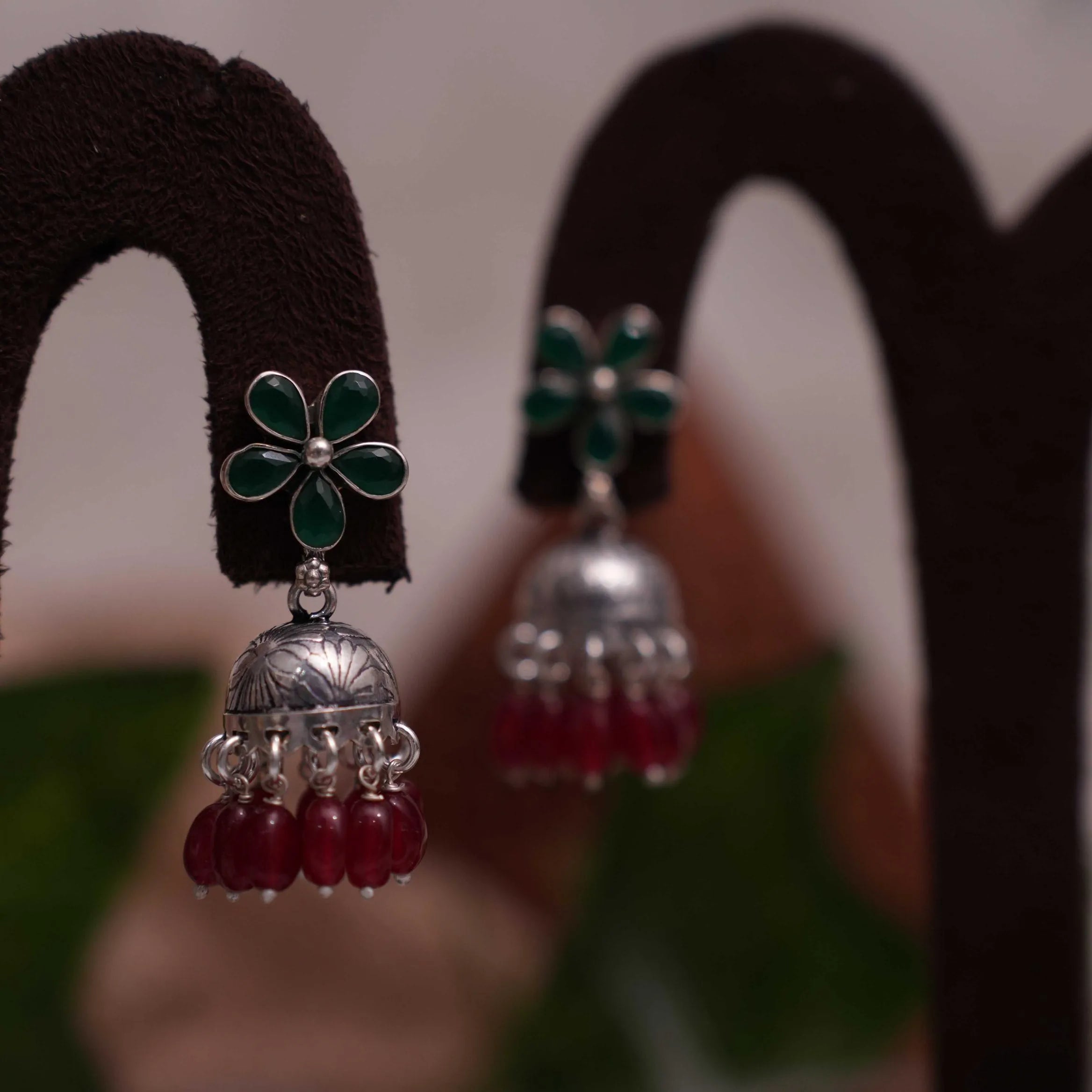 A regal silver jhumka earrings studded with green stones and adorn with red beads.