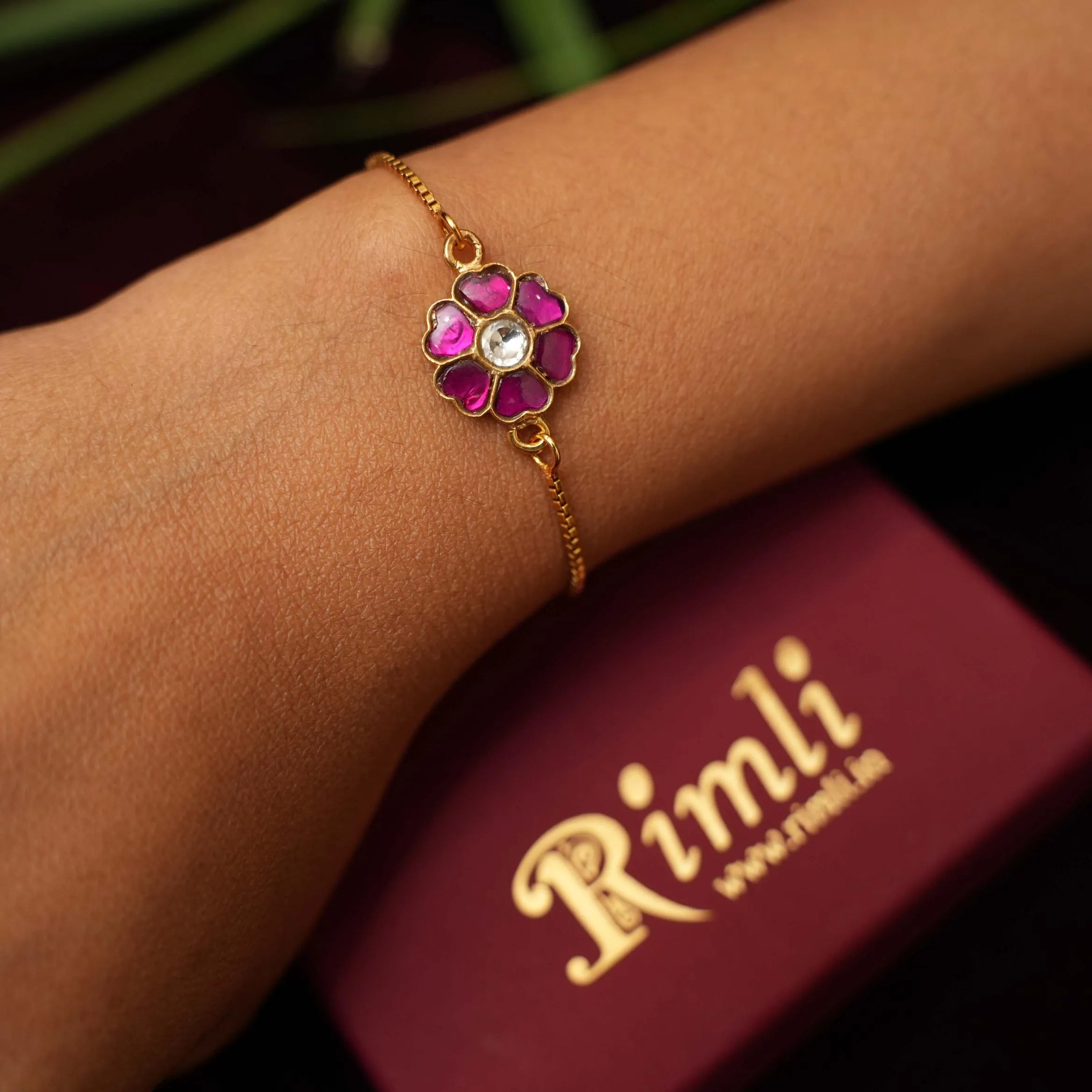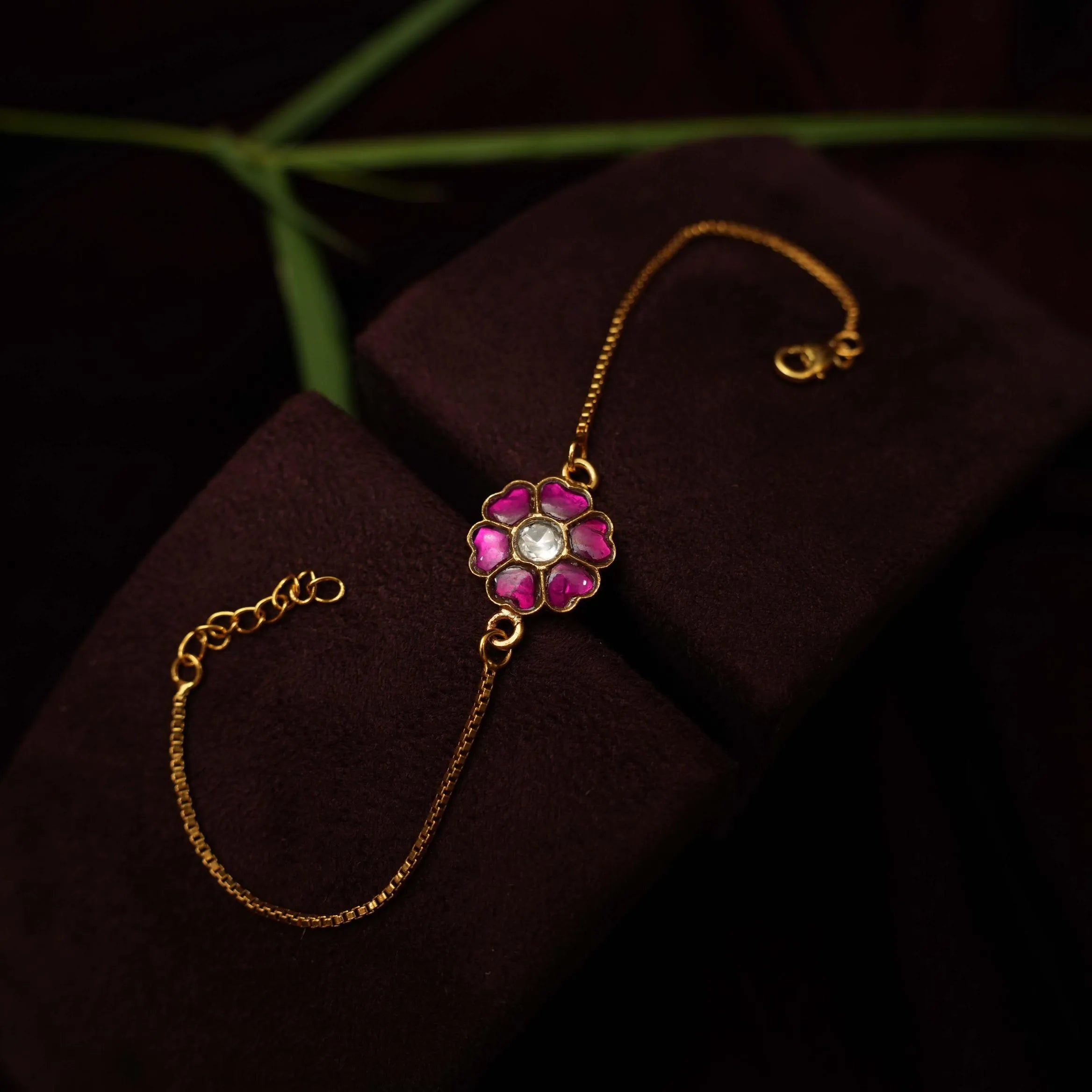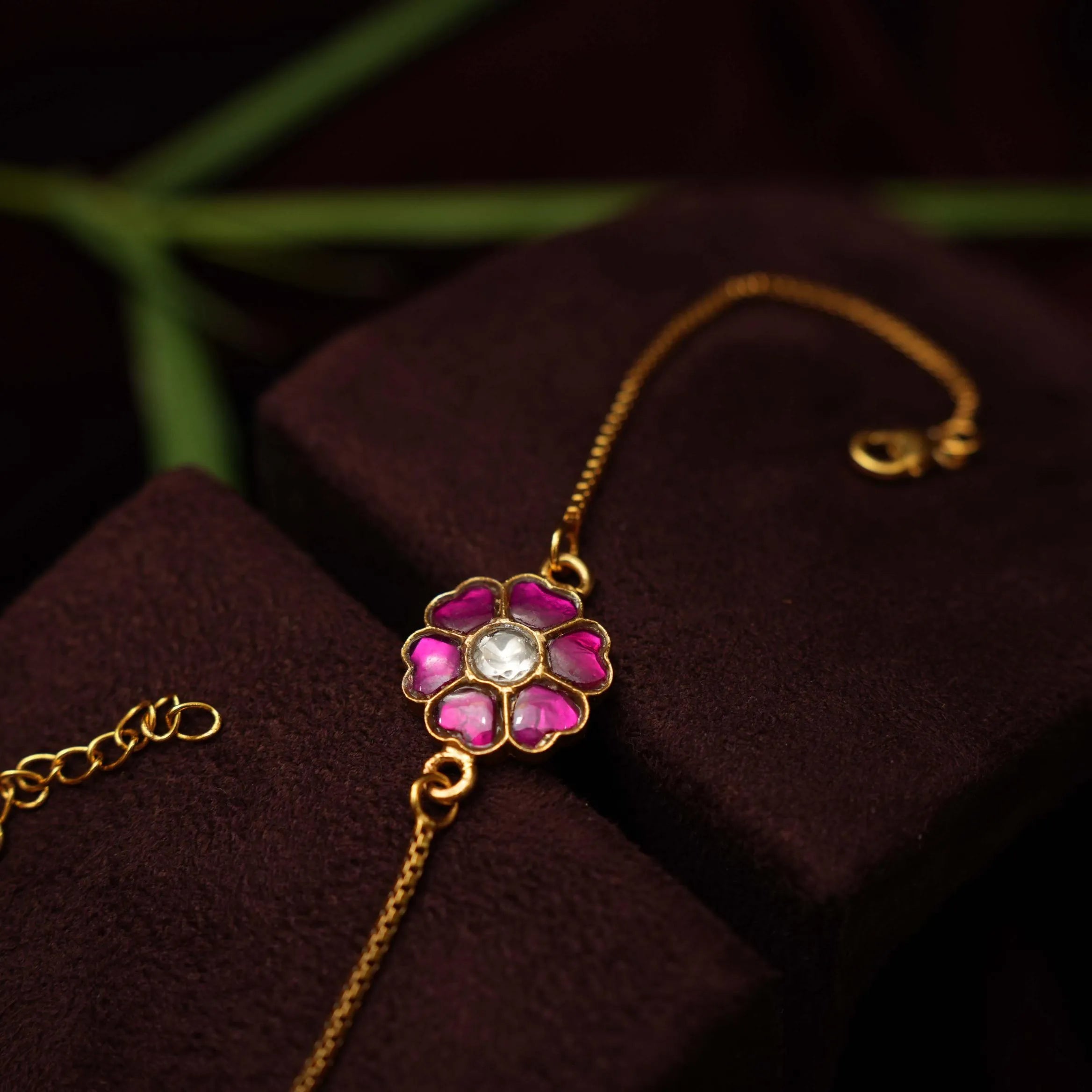 A regal silver bracelet in floral motif studded with reddish pink stones.