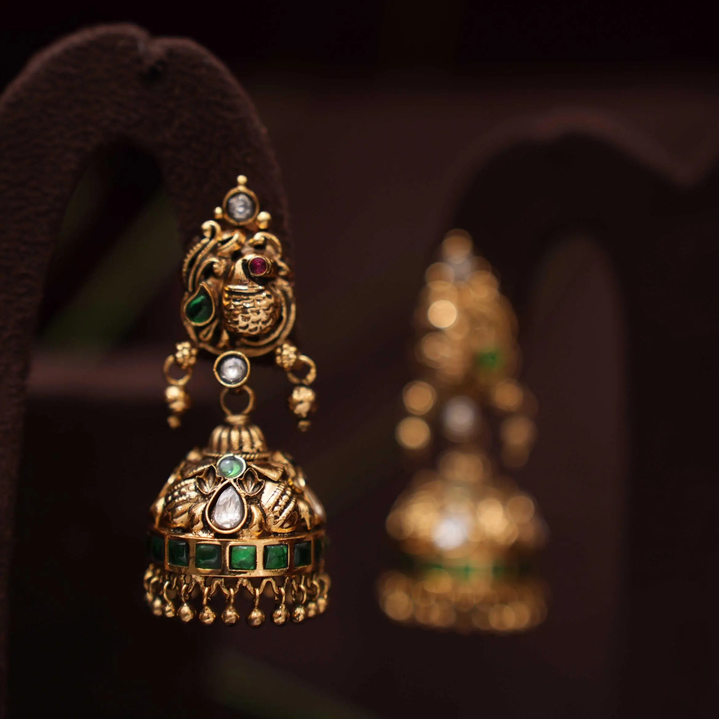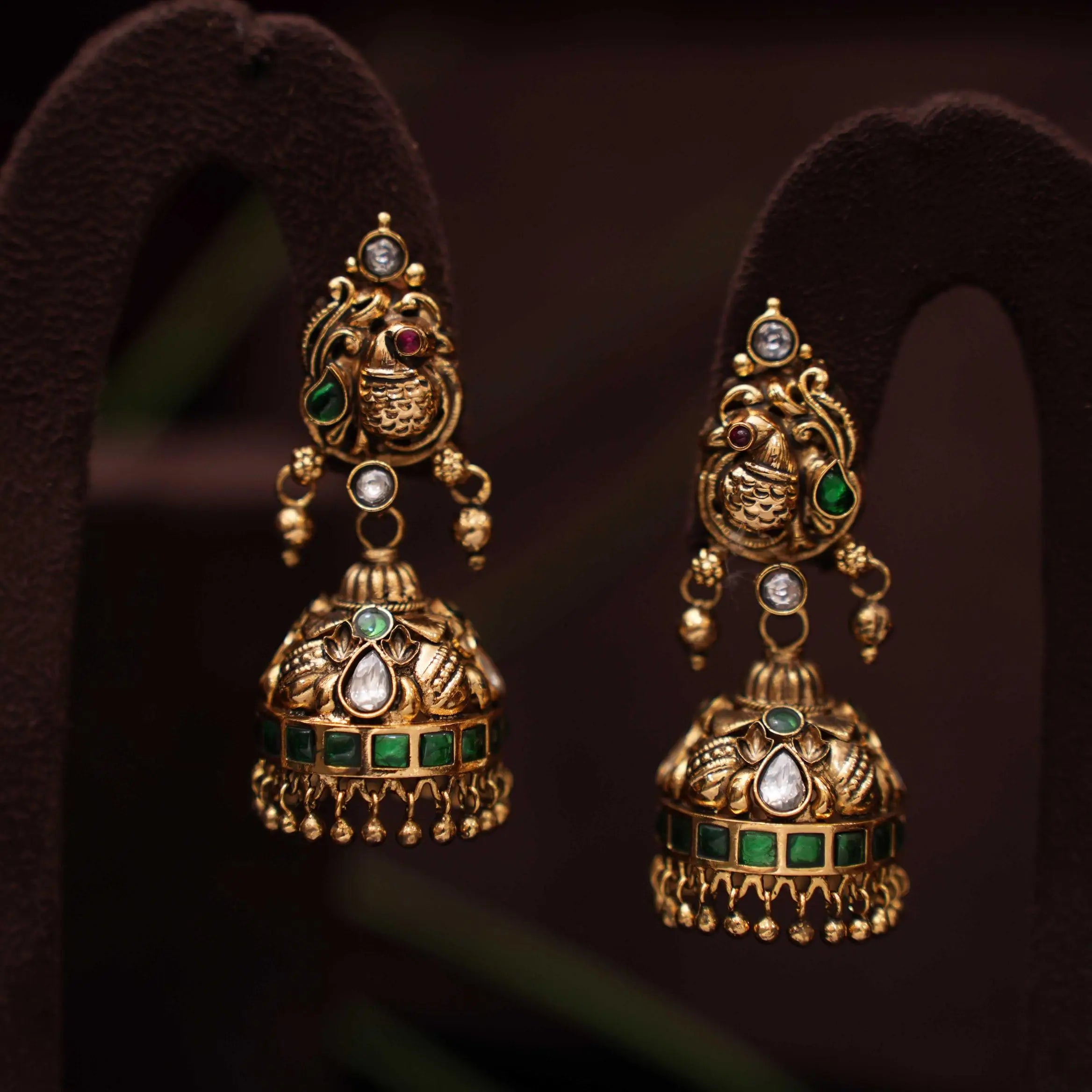 A traditional antique jhumka earrings in peacock motif studded with kemp stones adorn with golden balls finely finished in Nagas finish.