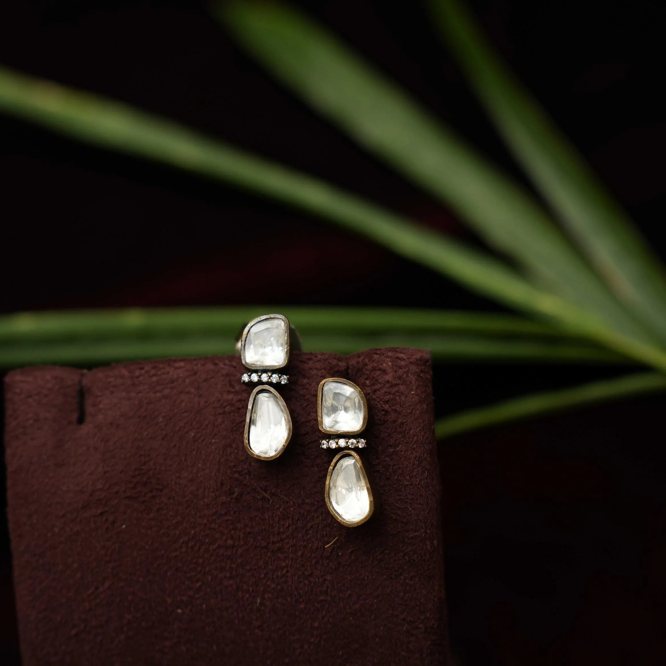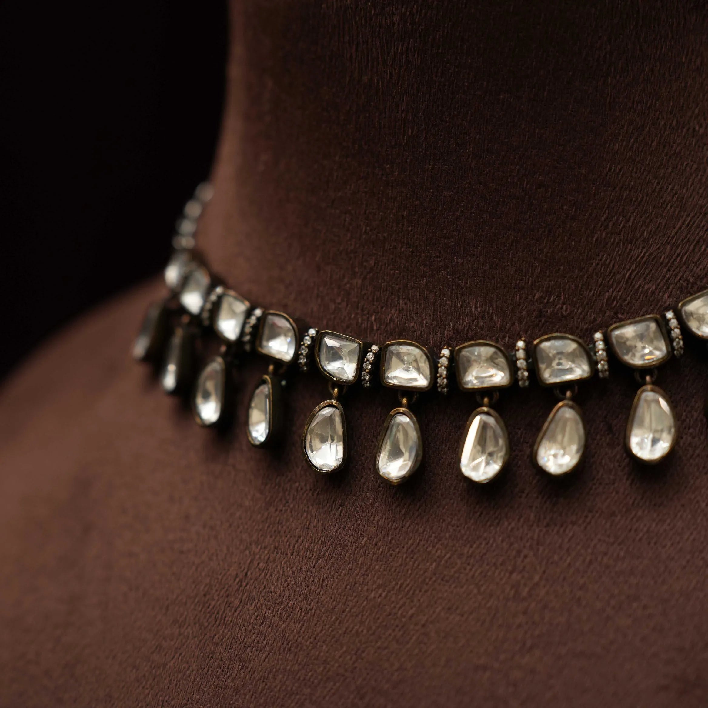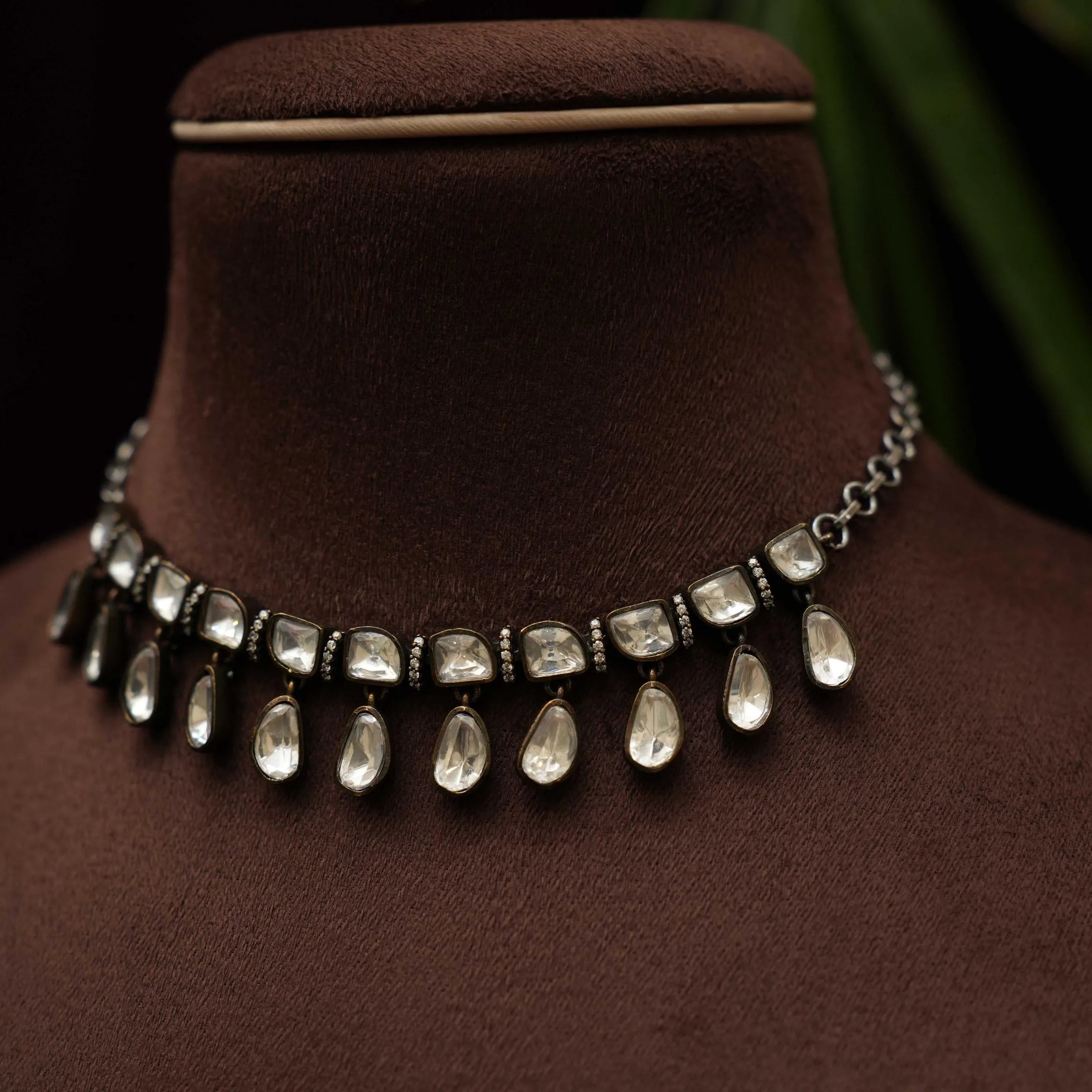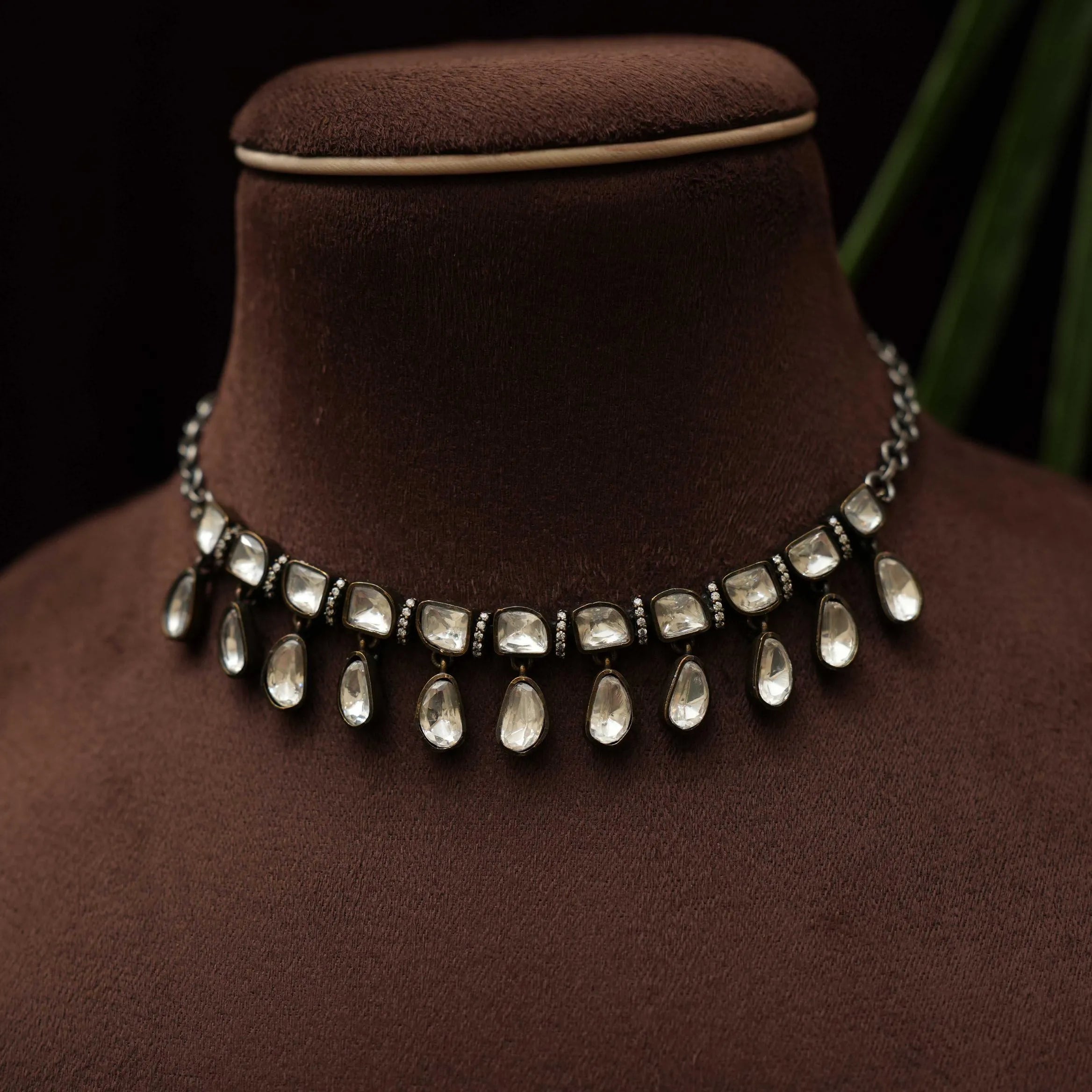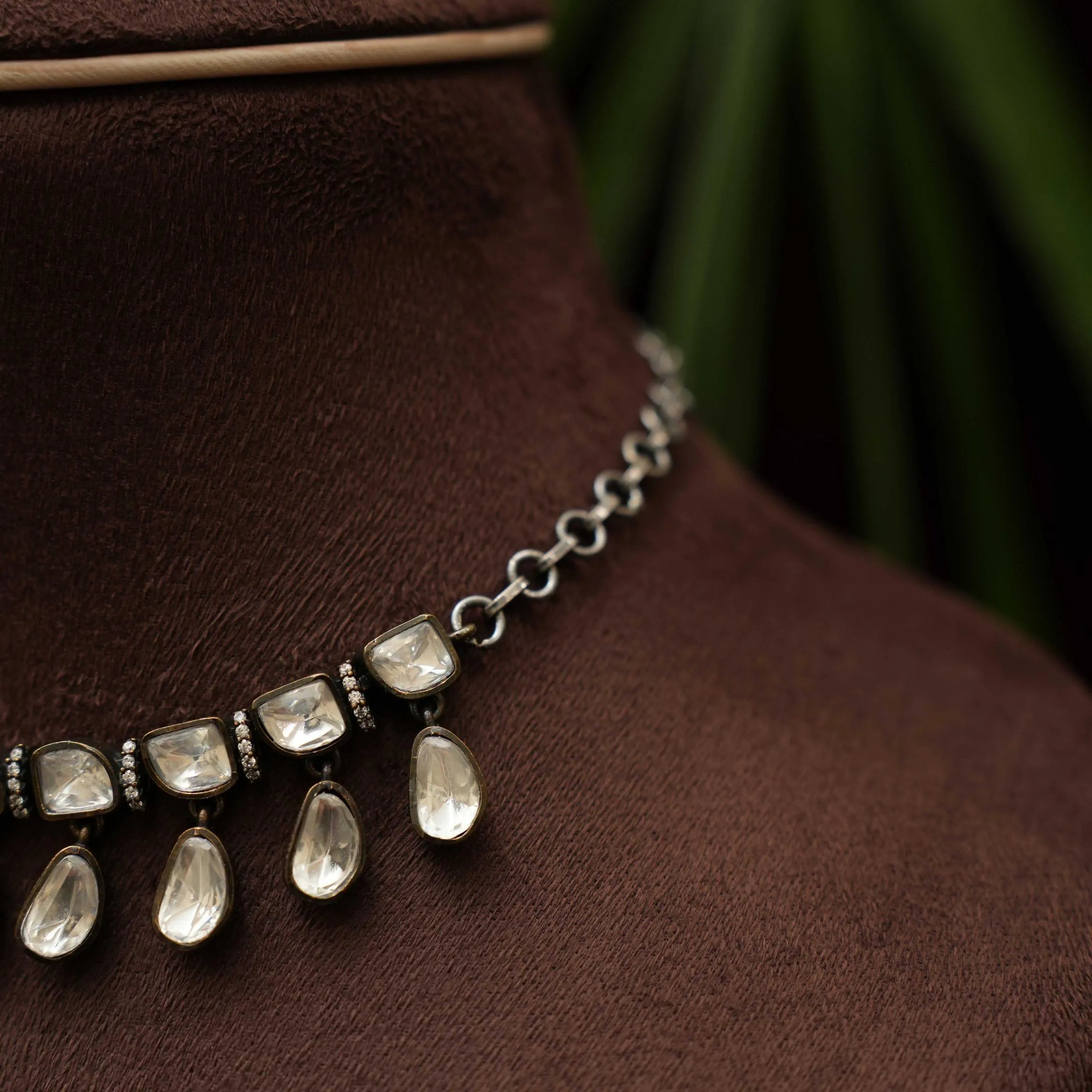 A classic silver necklace studded with Victorian Kundan stones. This set comes with a pair of earrings.