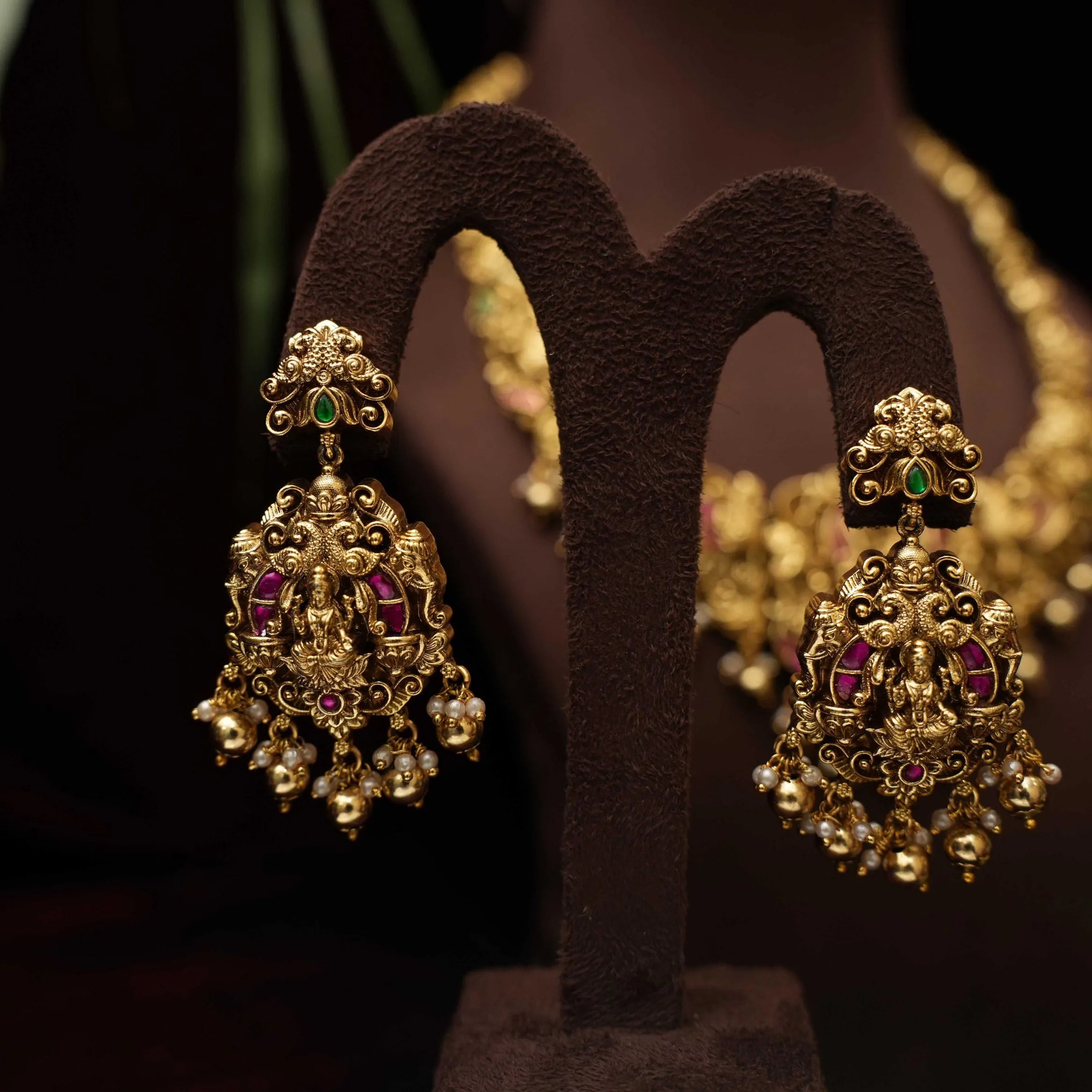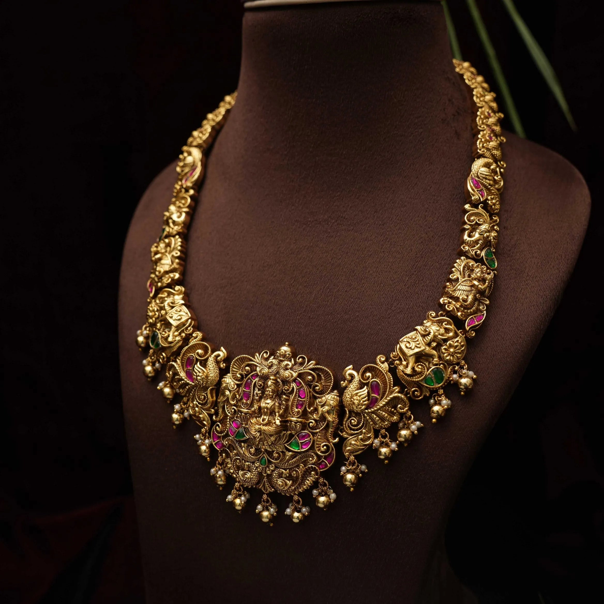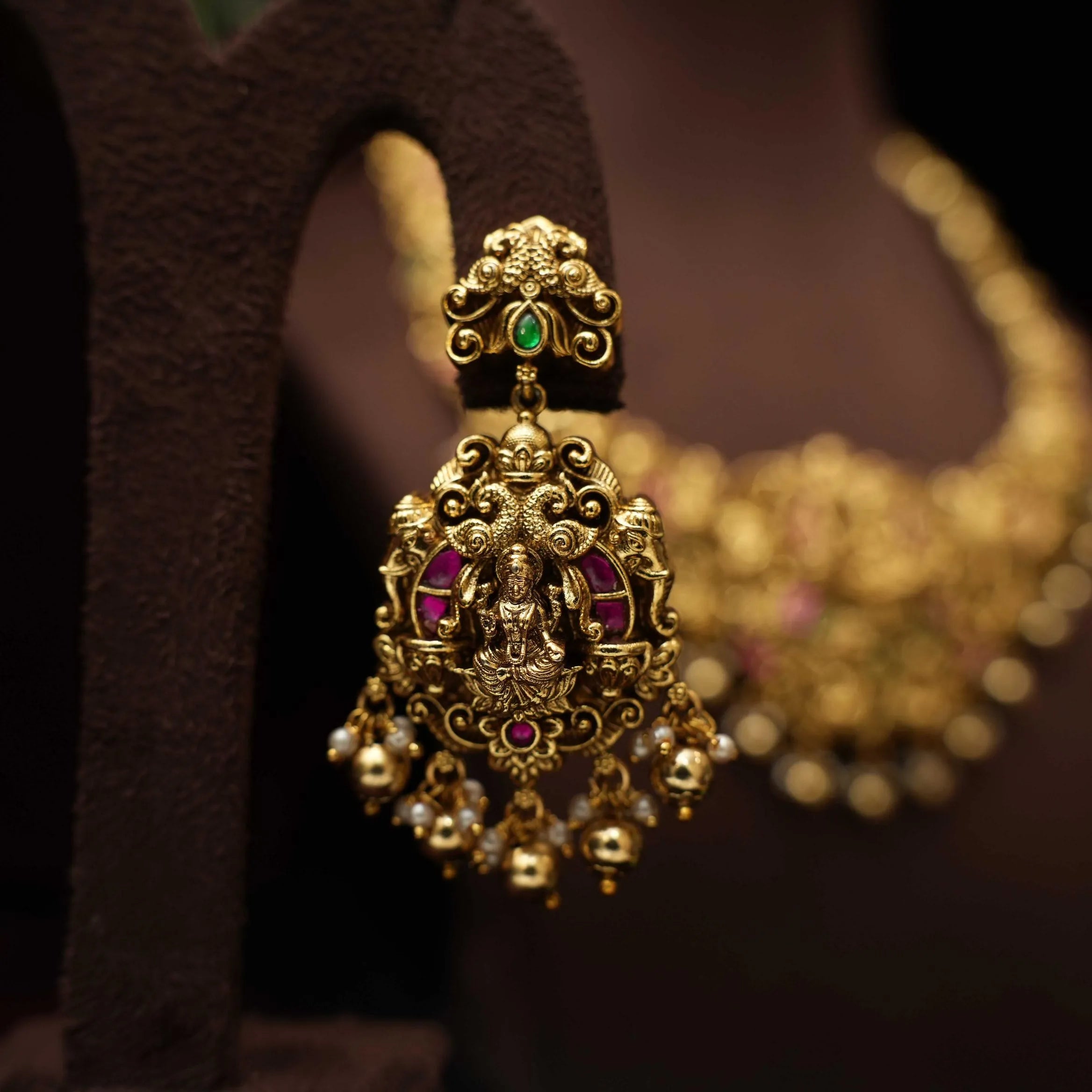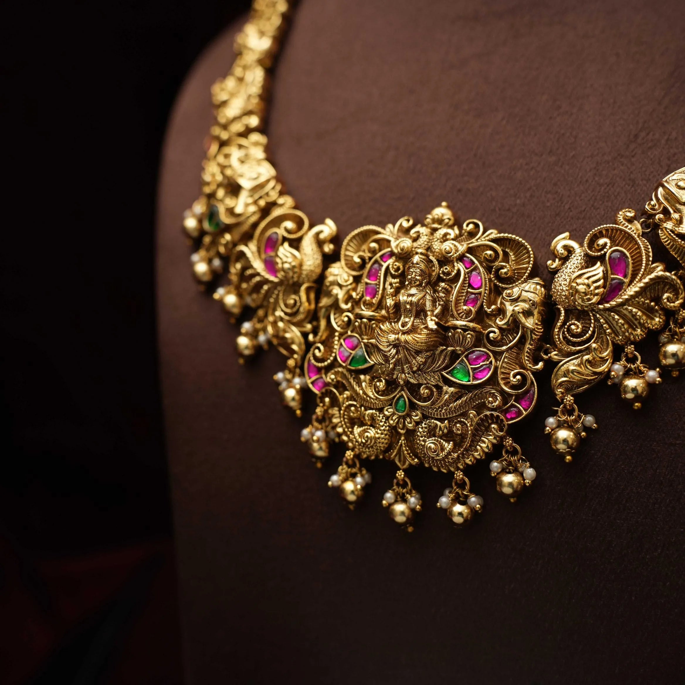 A statement antique temple necklace in traditional Goddess Lakshmi and peacock motif studded with kemp stones adorn by golden balls. This set comes with a pair of earrings.