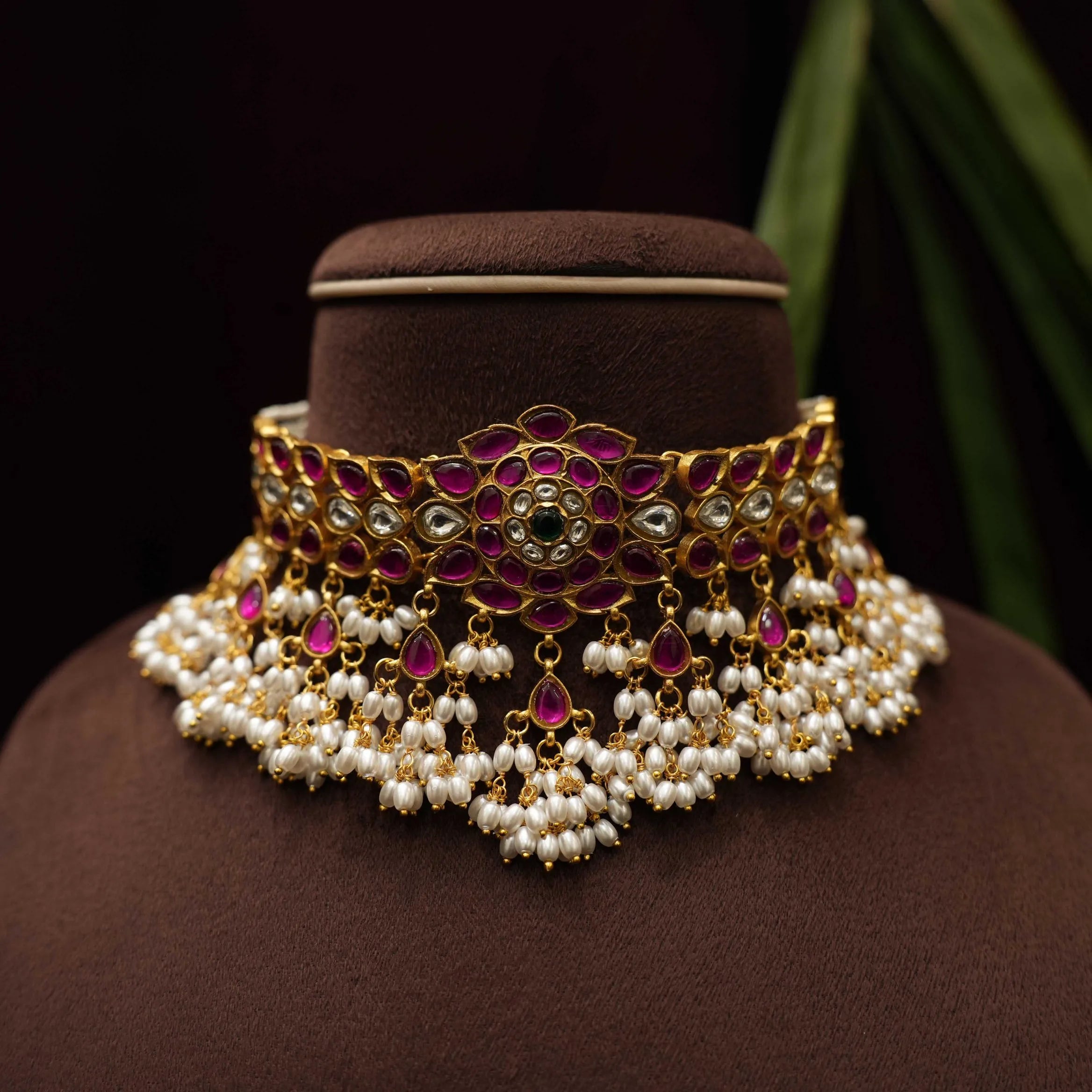 A beautiful necklace handcrafted in floral motif studded with polki stones highlighted by pearls.