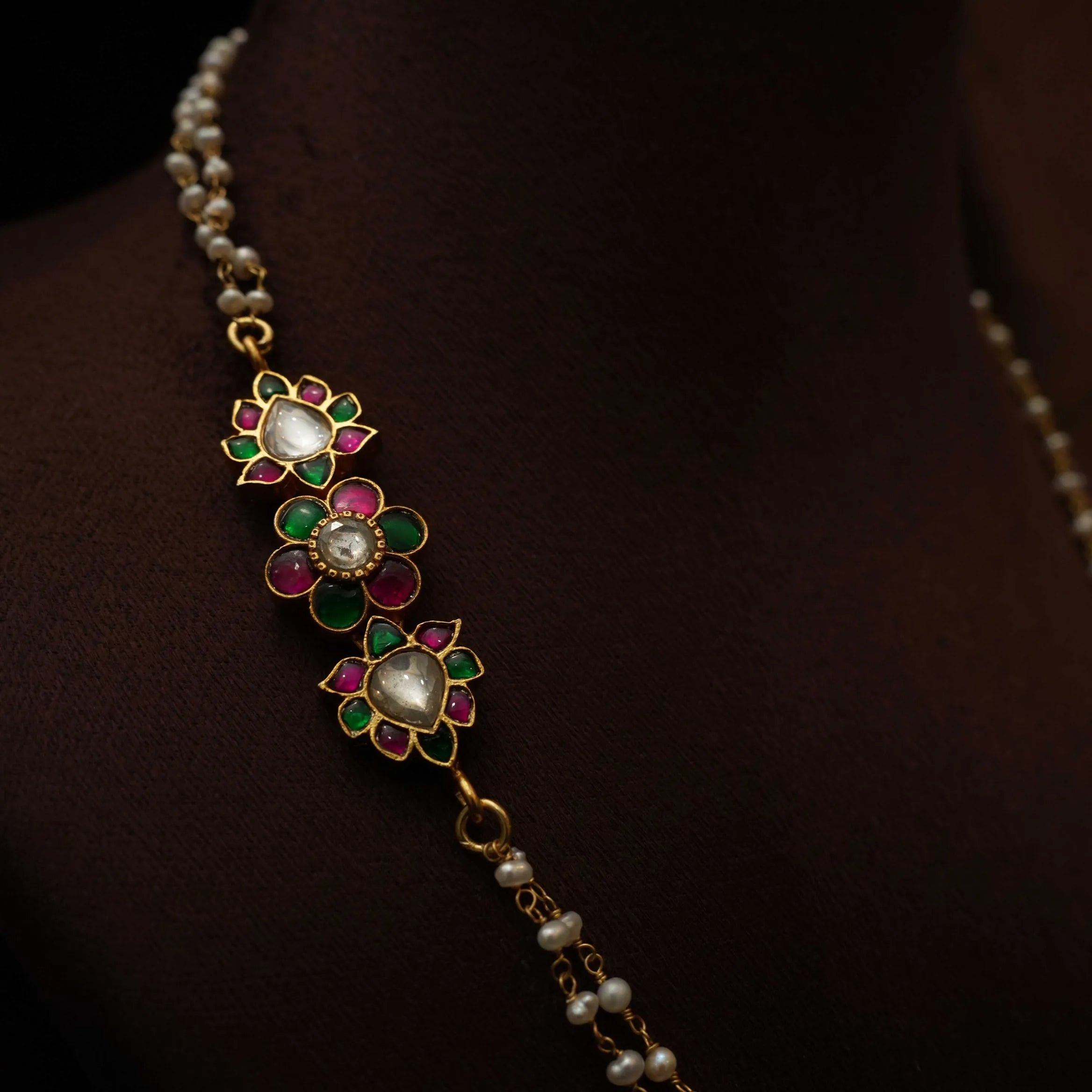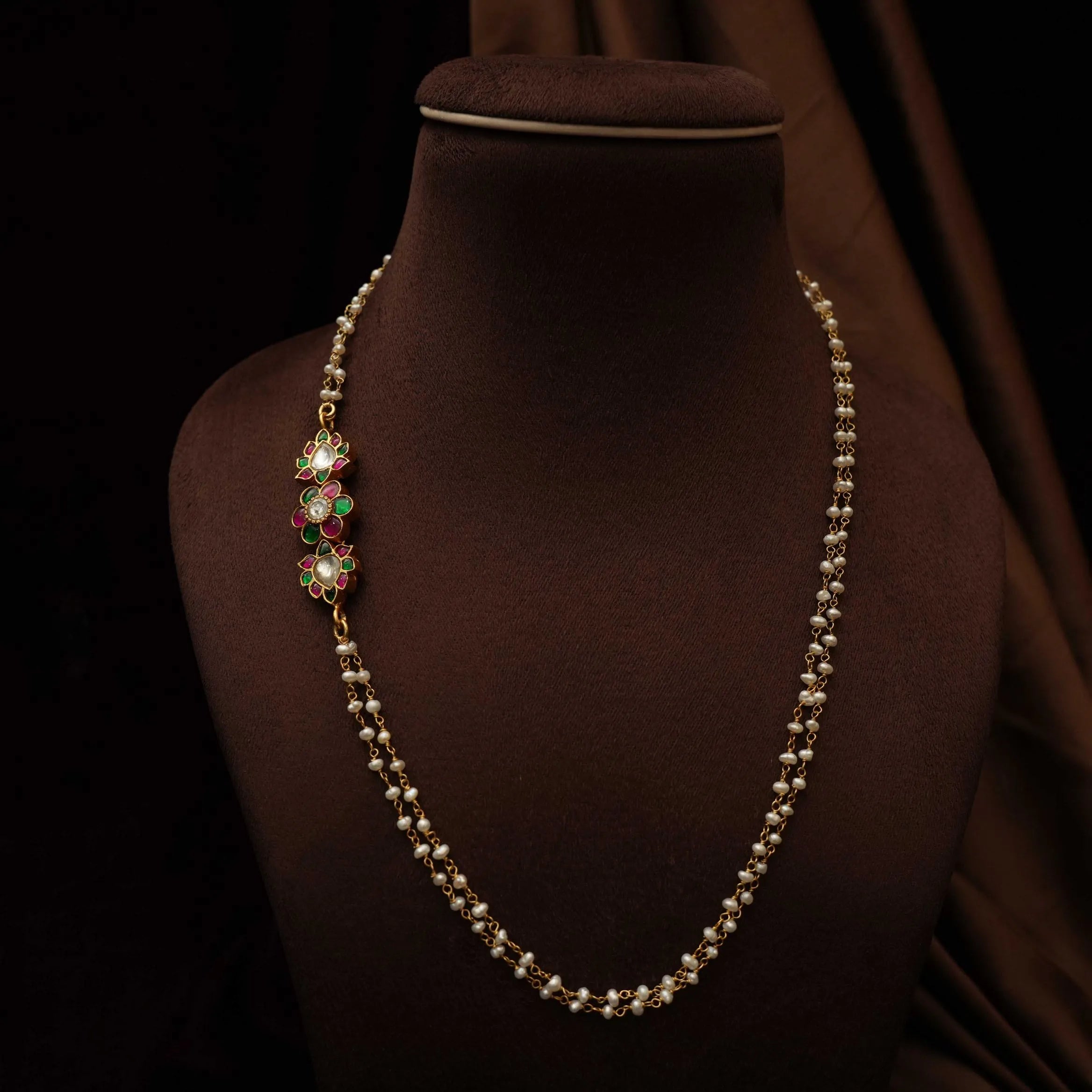 A layered necklace handcrafted in pearls adorn with 925 silver floral pendant.