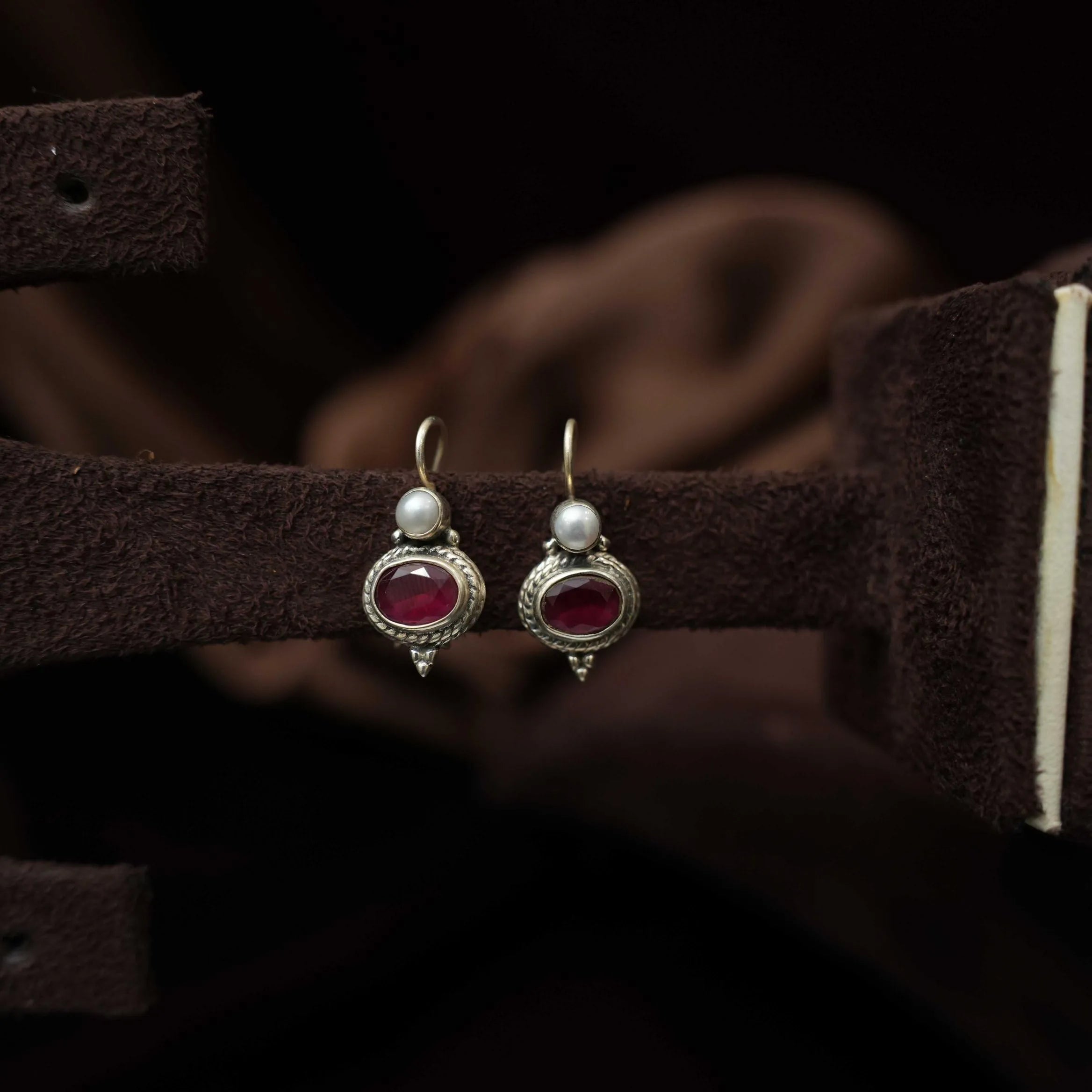 A classic silver oxidsed hoop earring studded with red stones.