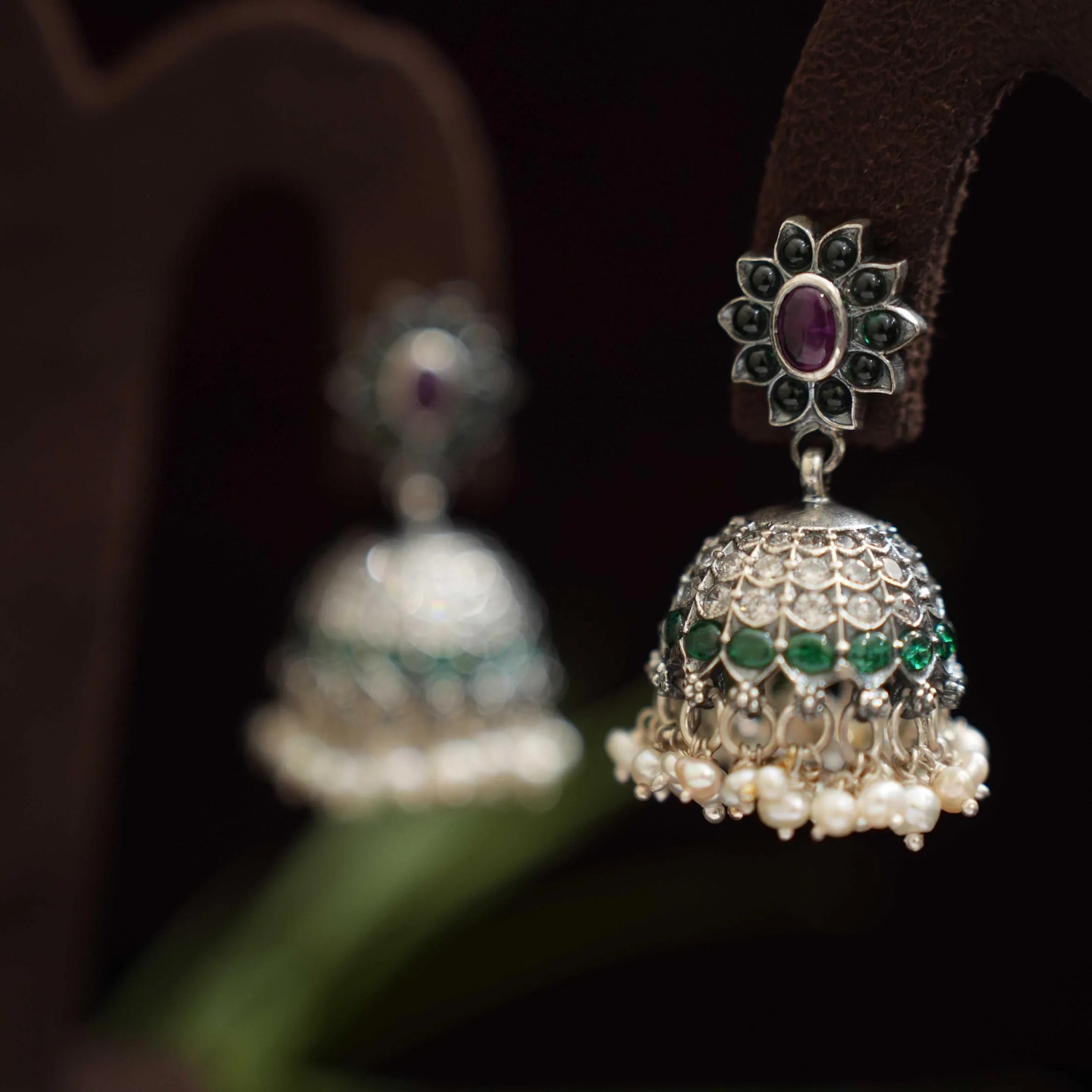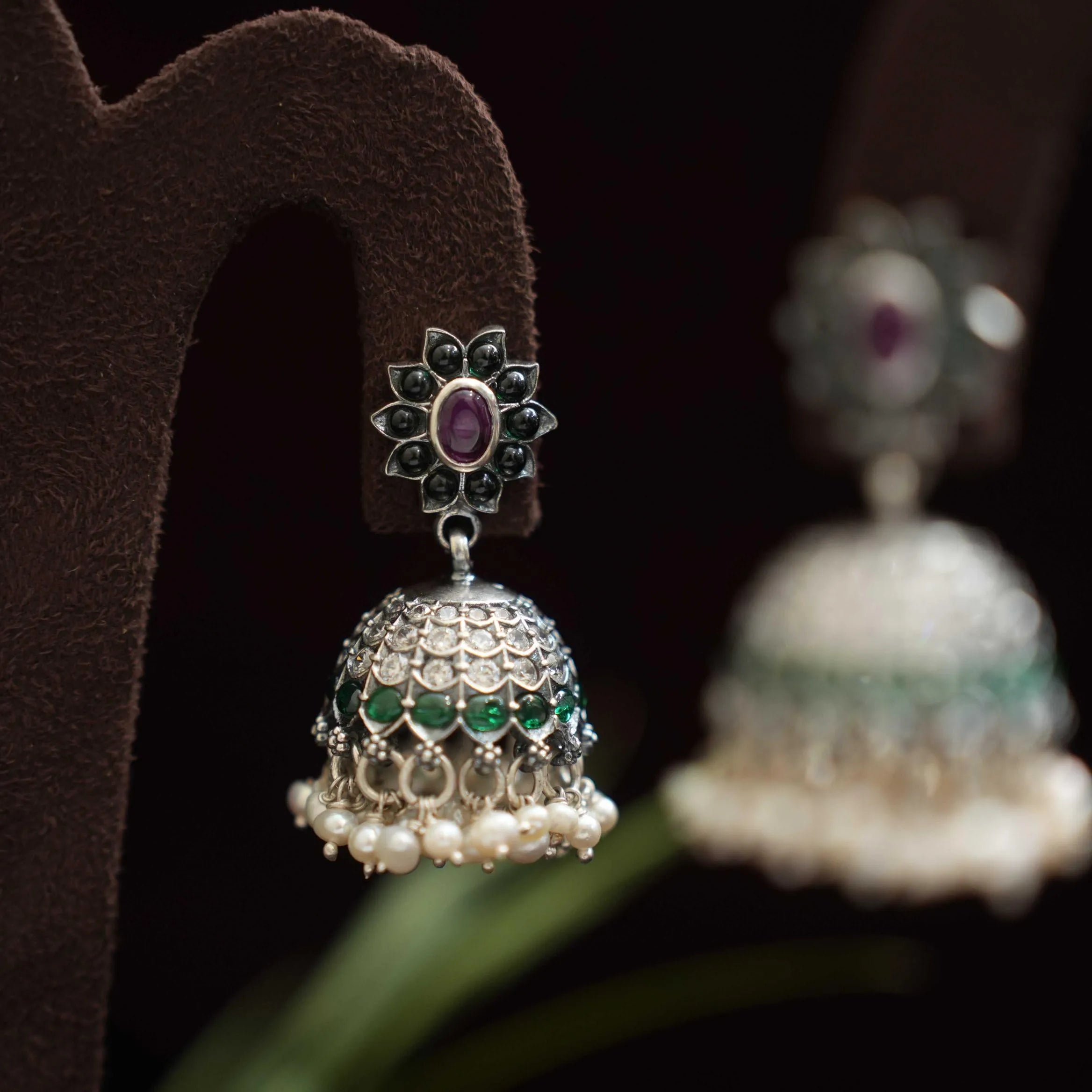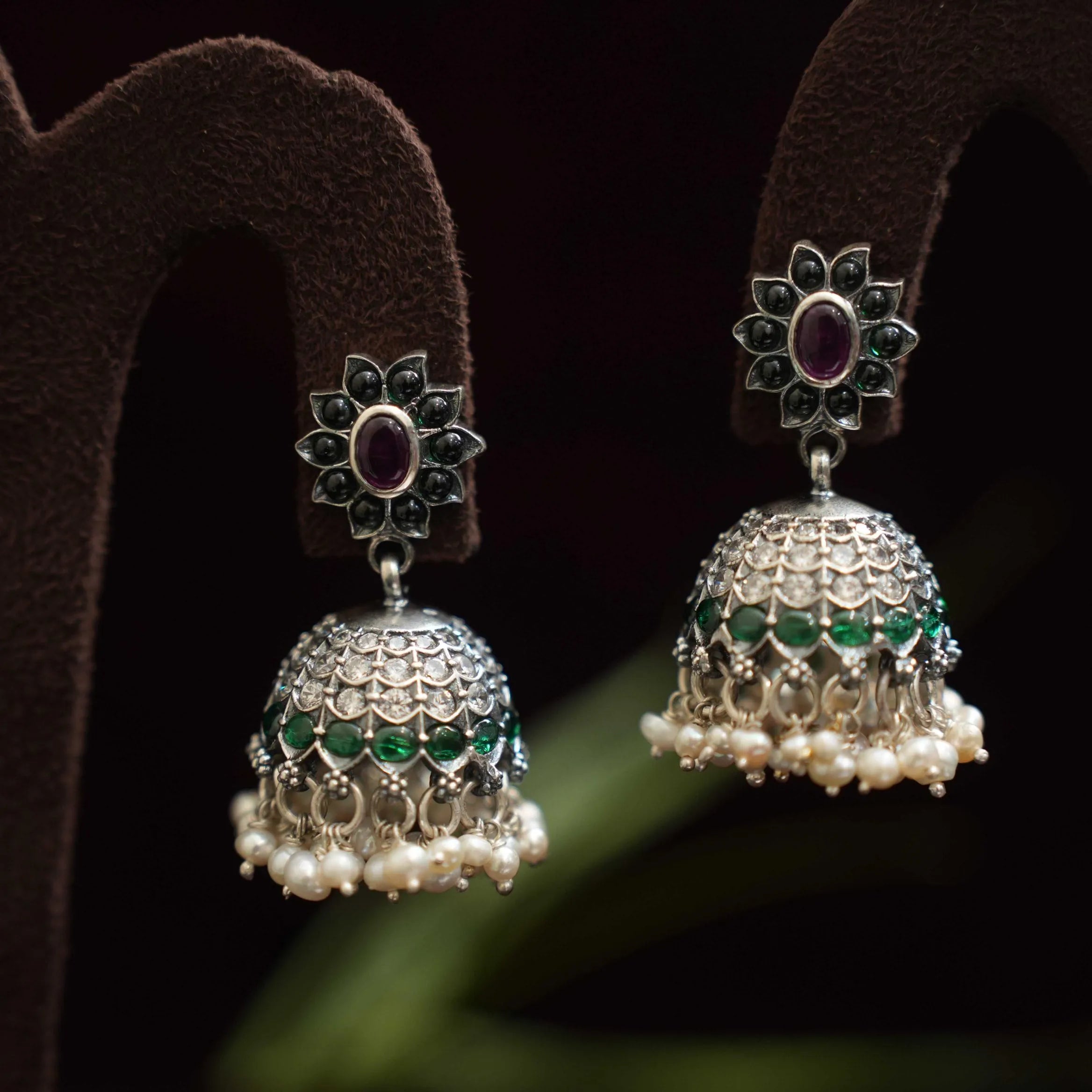 An elegant silver oxidised jhumka earrings adorn with green and white stones finished by pearls.