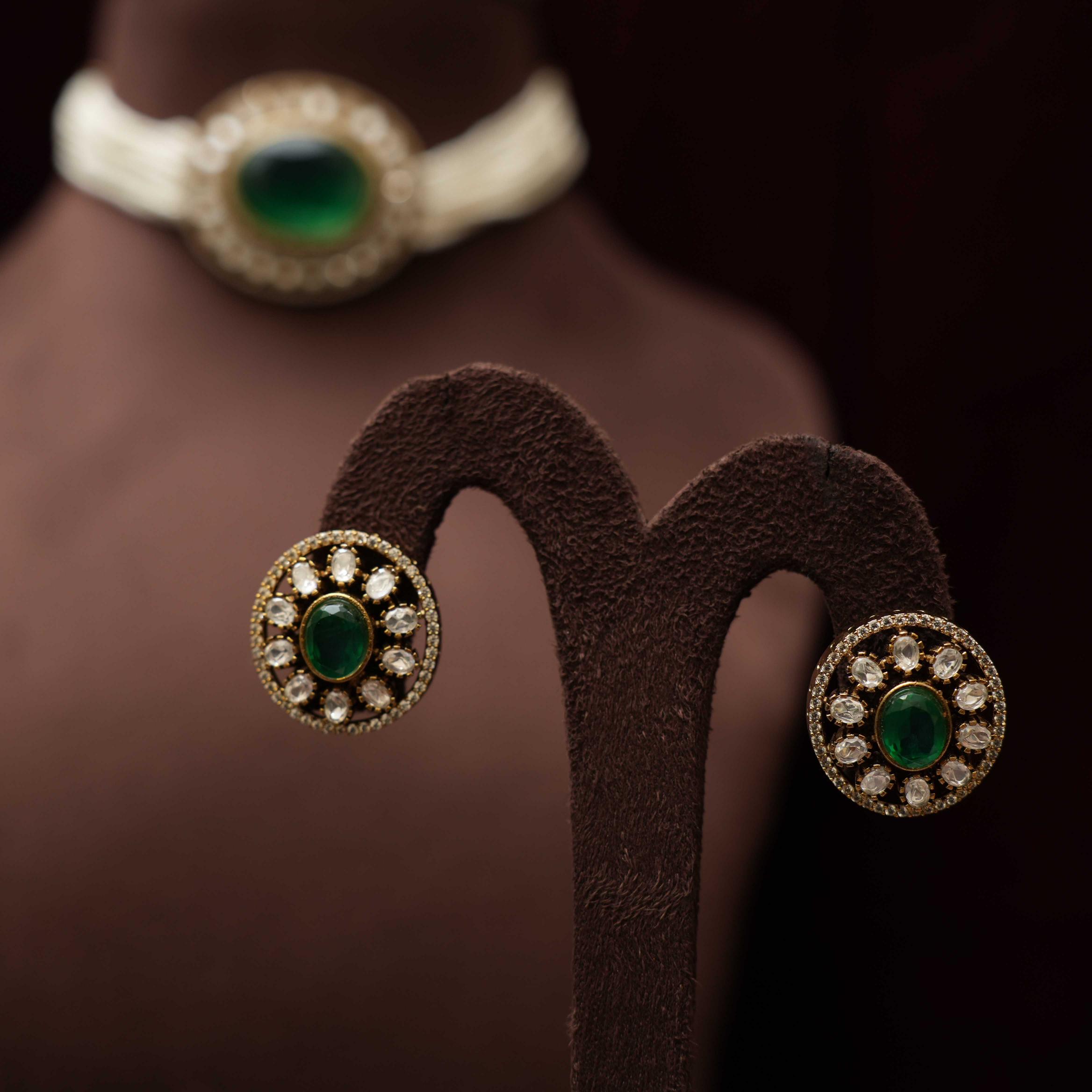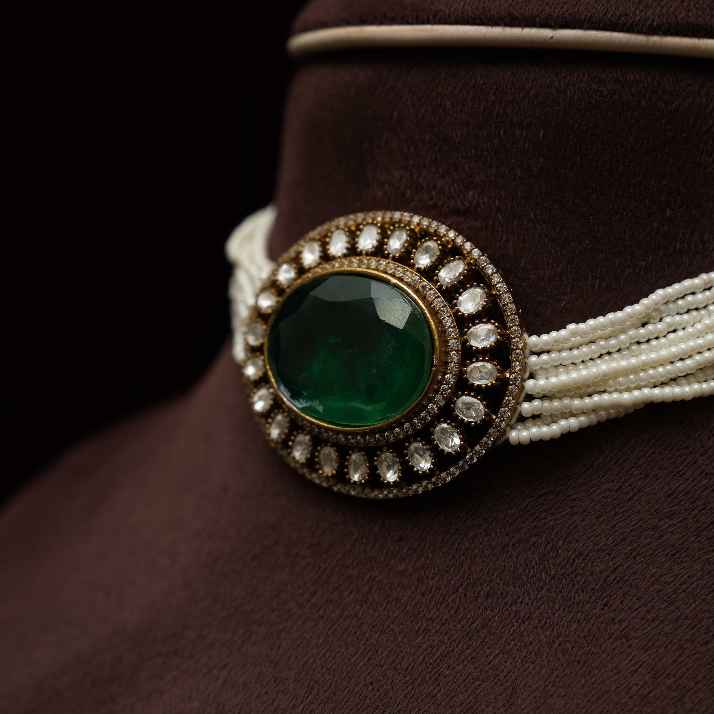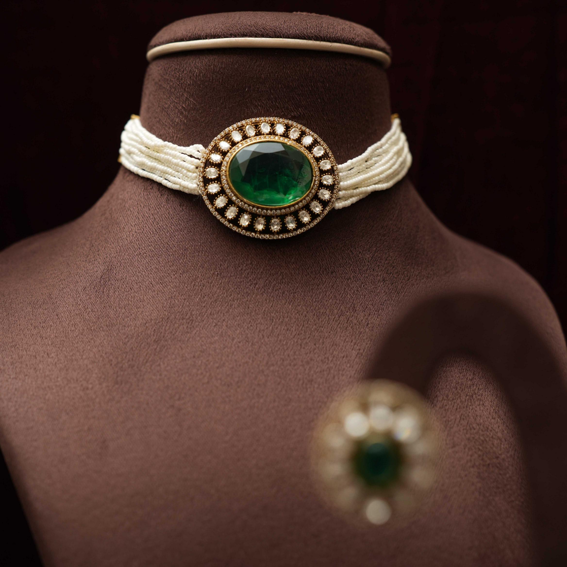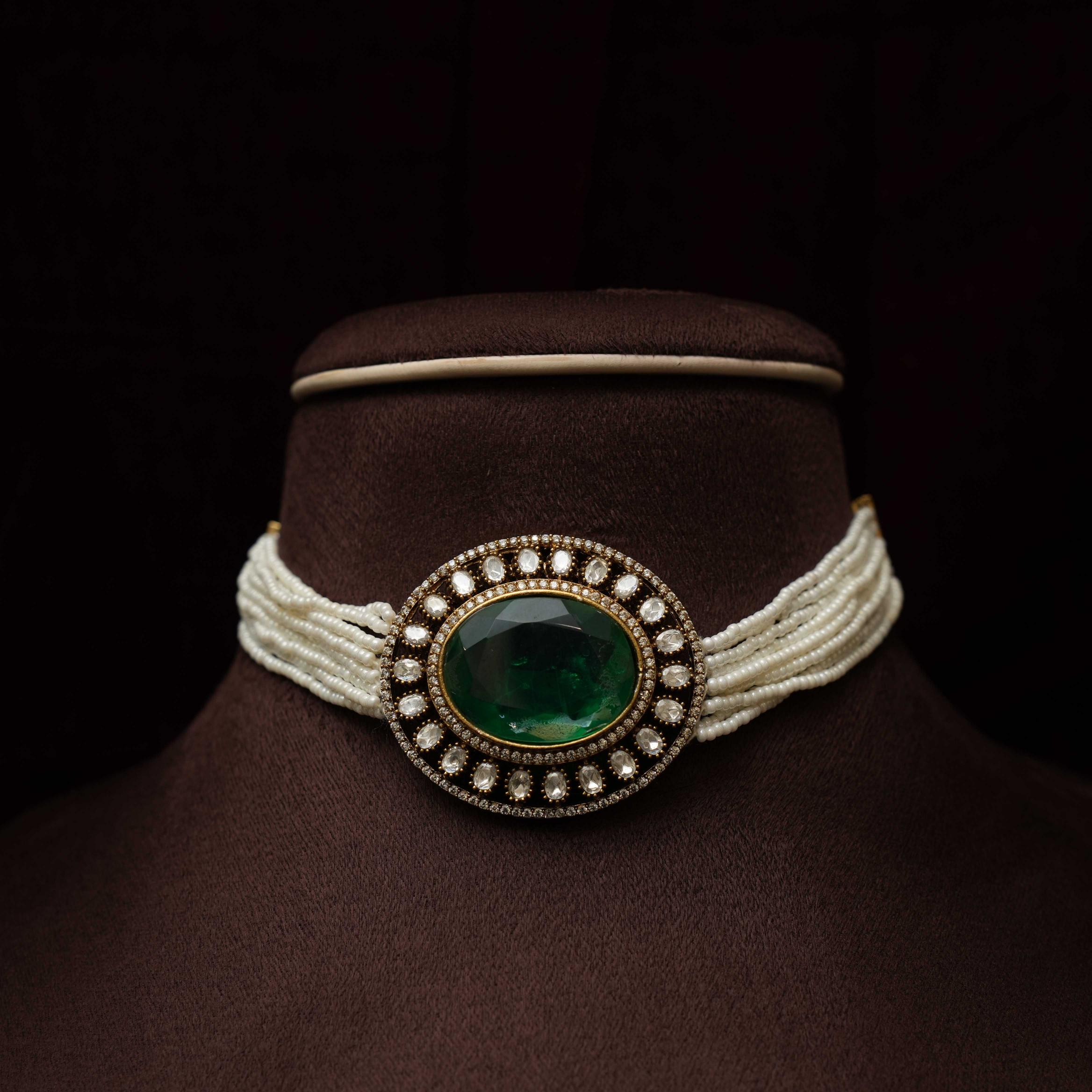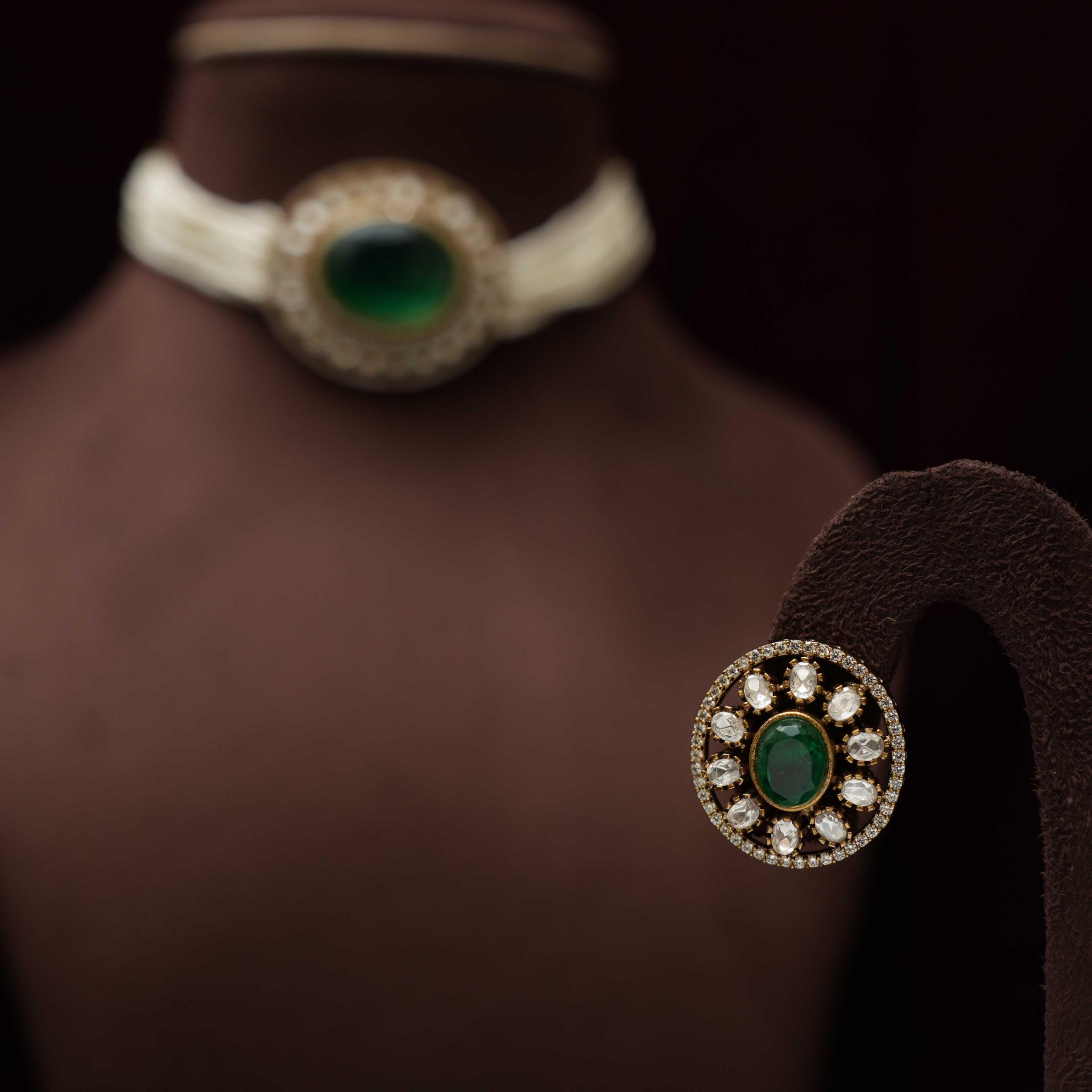 A beautiful choker handcrafted with Victorian polki pendant adorn with green agate. This set comes with a pair of earrings.