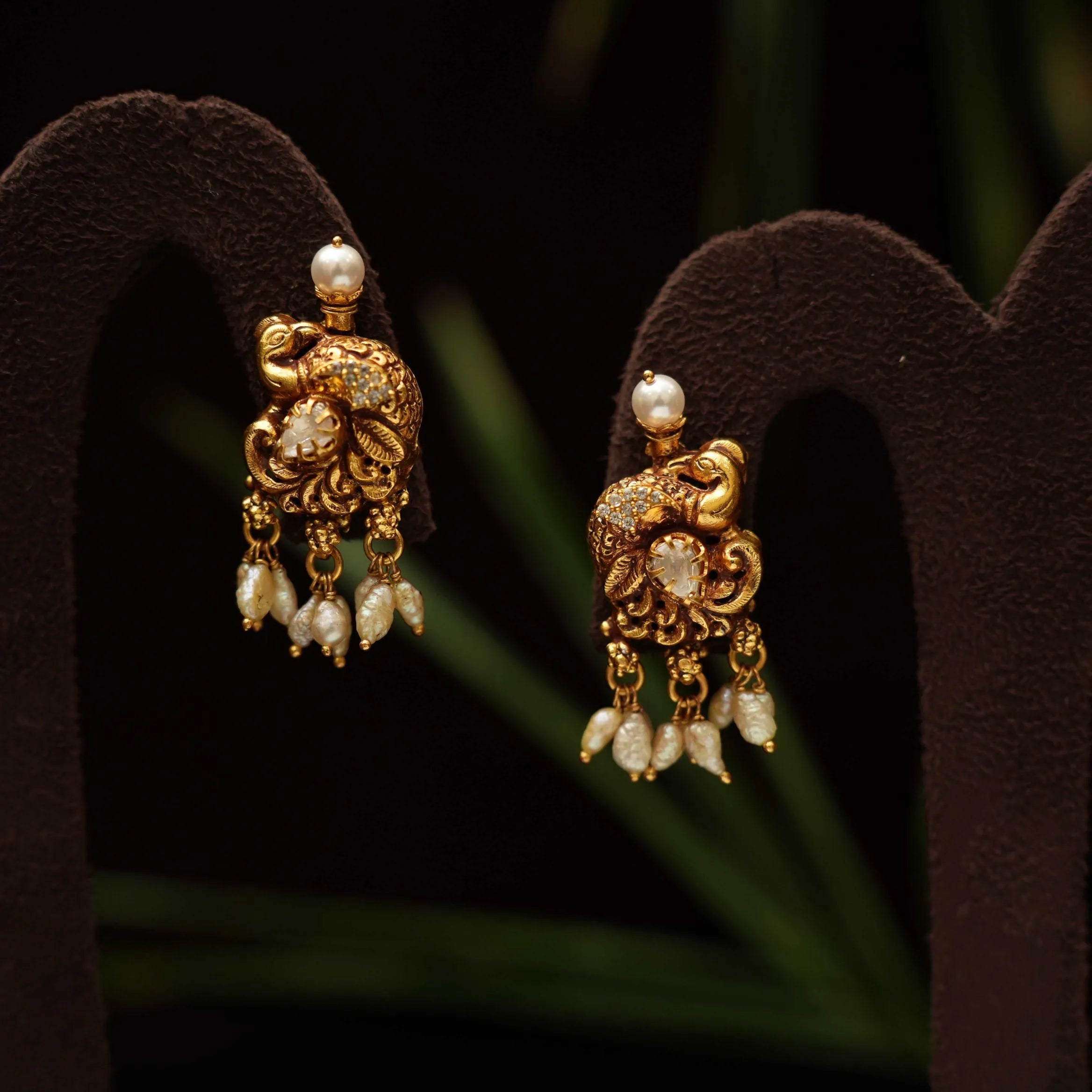 A beautiful silver earrings in peacock motif adorn with rice pearls.