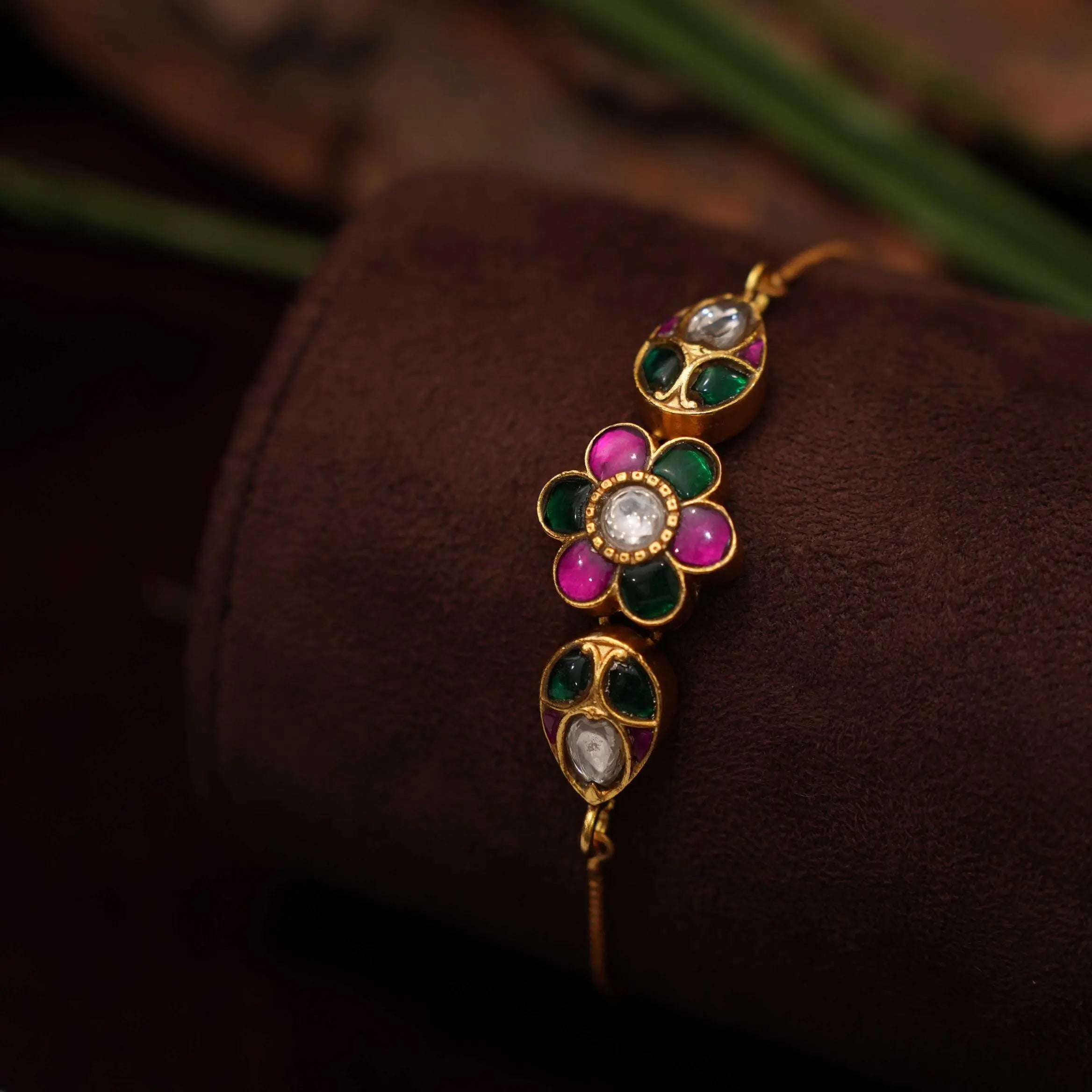A beautiful silver bracelet in floral motif studded with white, green and reddish pink stones.