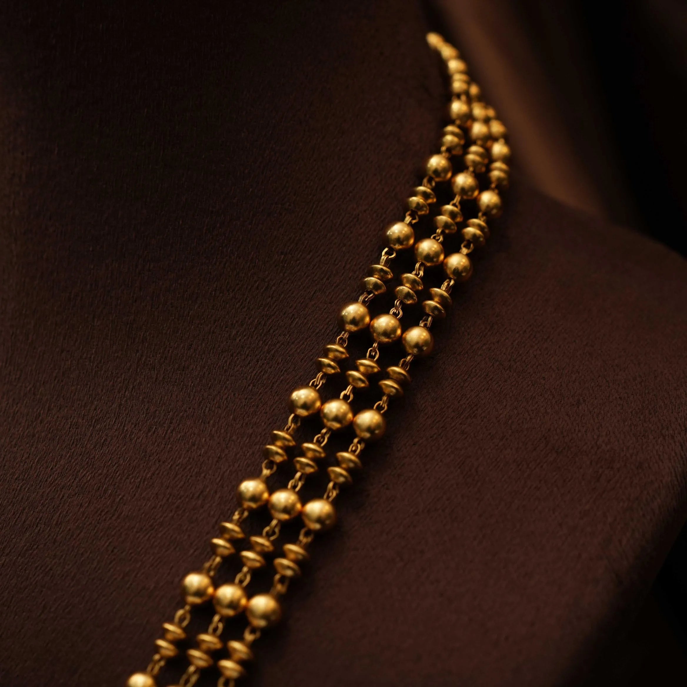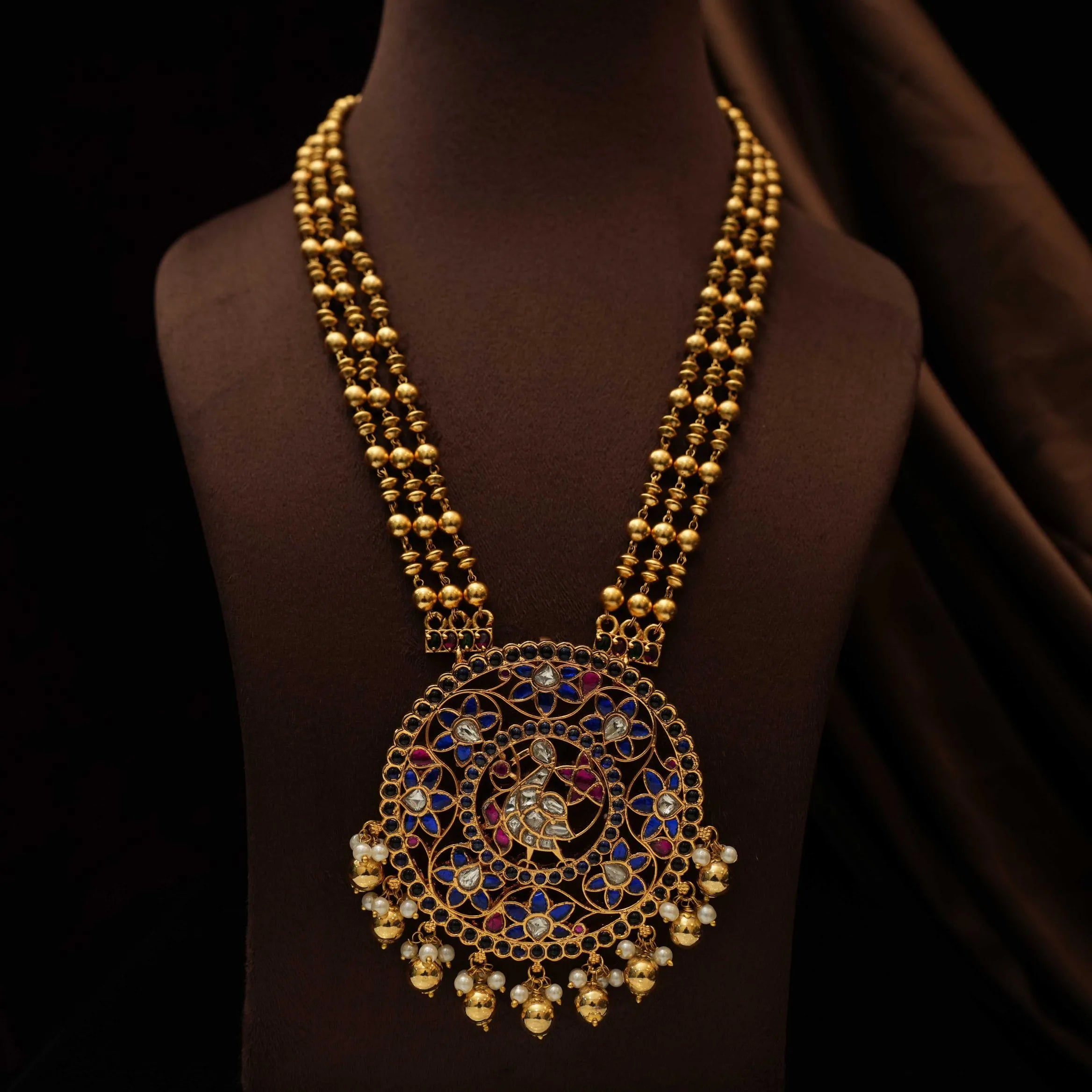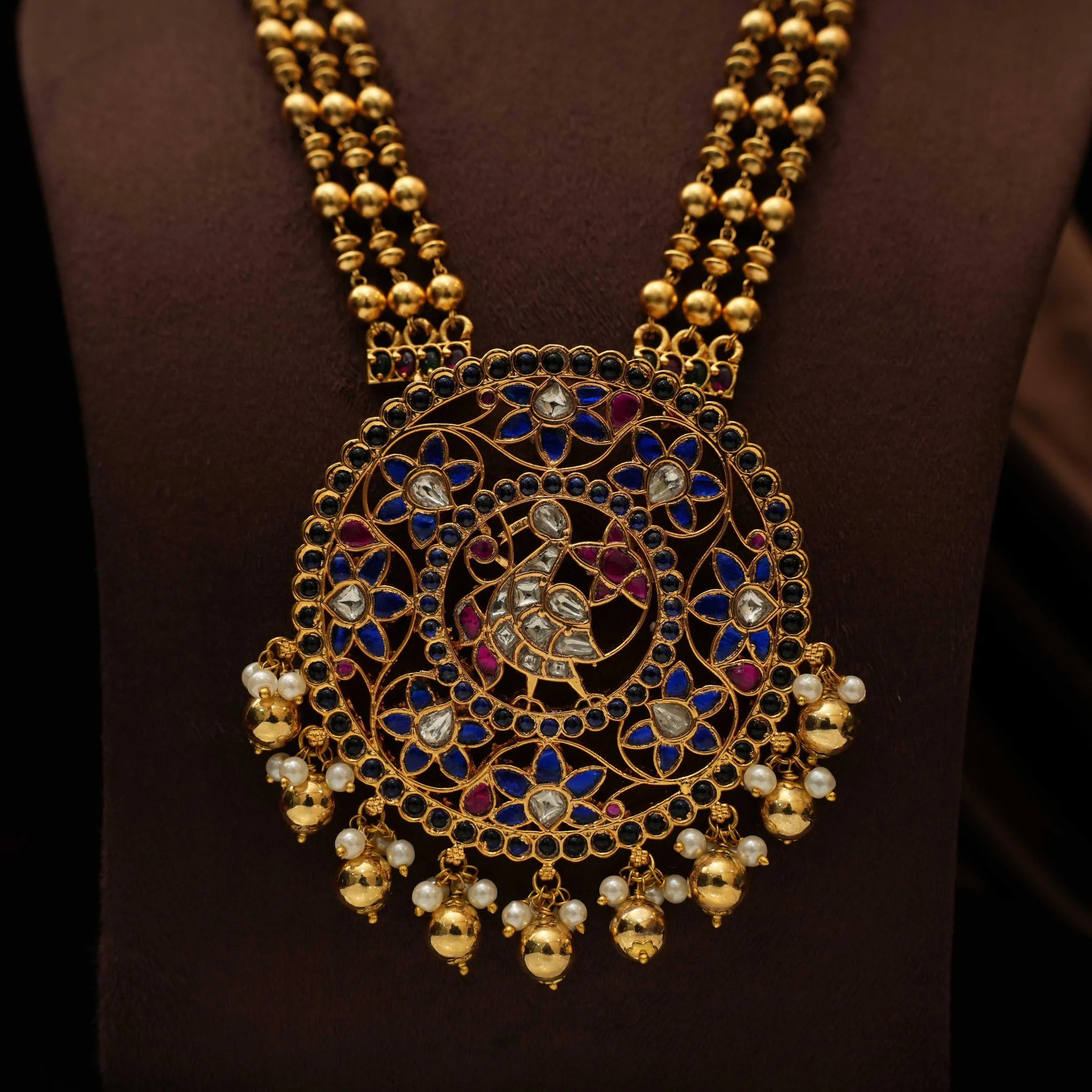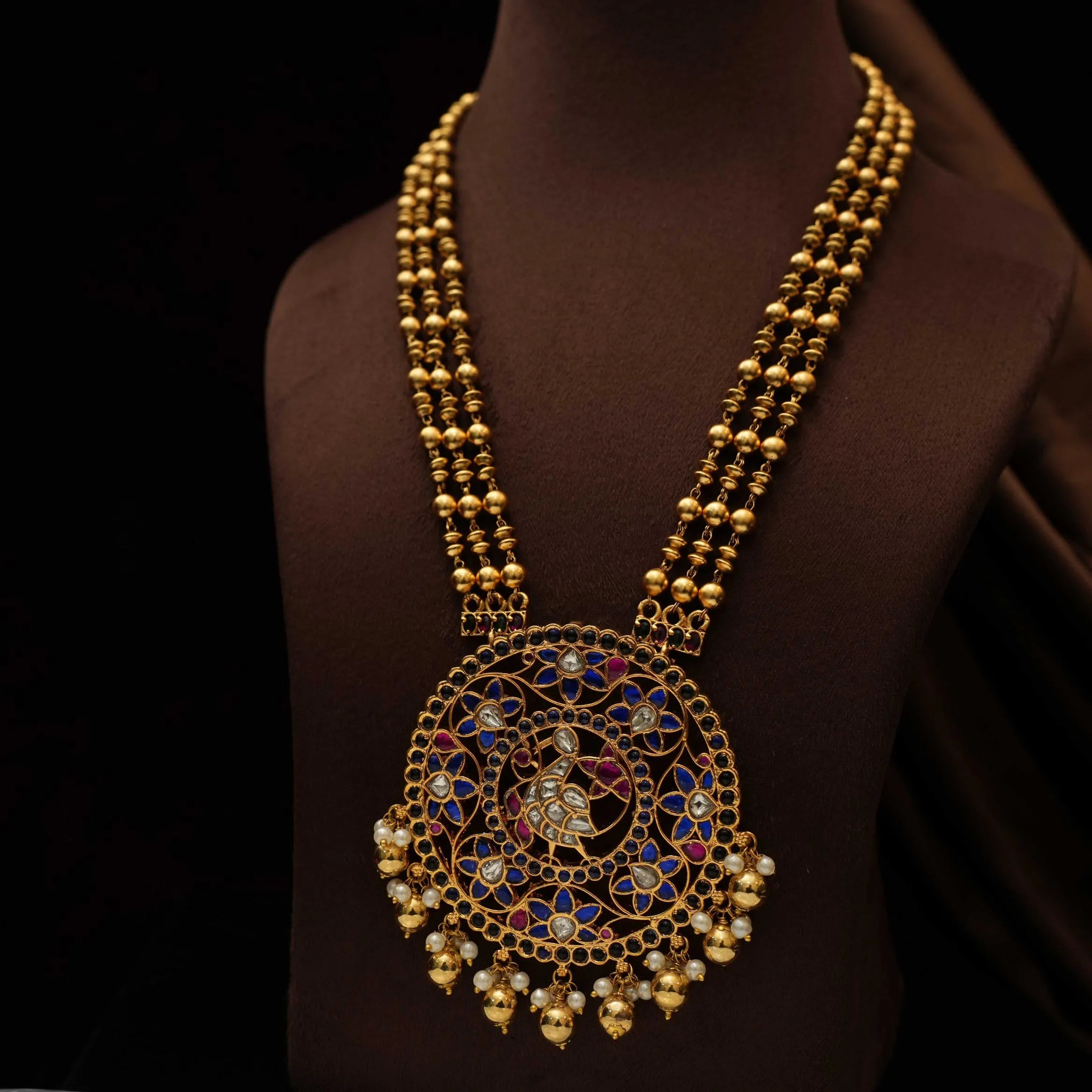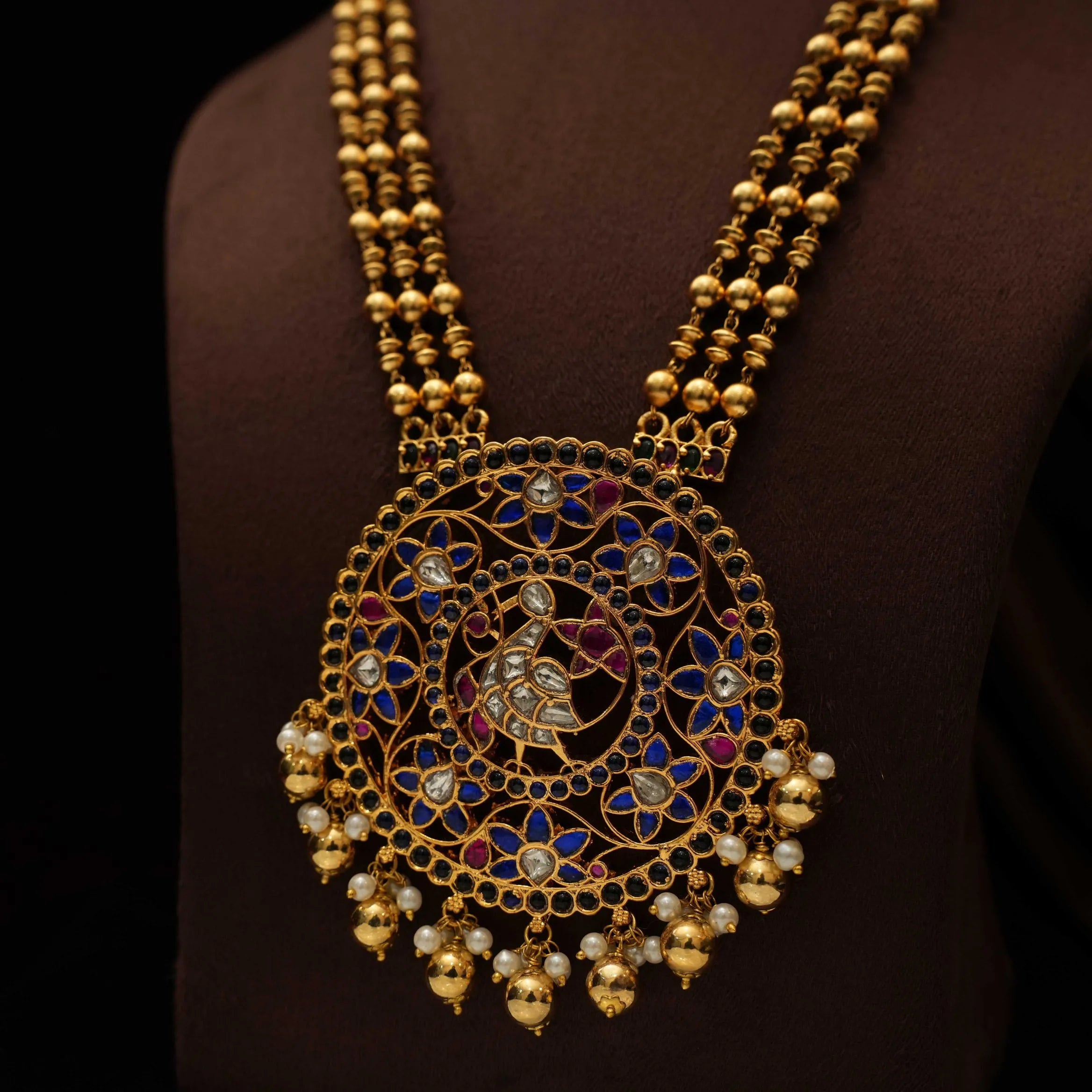 A beautiful layered necklace in traditional peacock studded with polki stones, cluster pearls paired to golden balls.