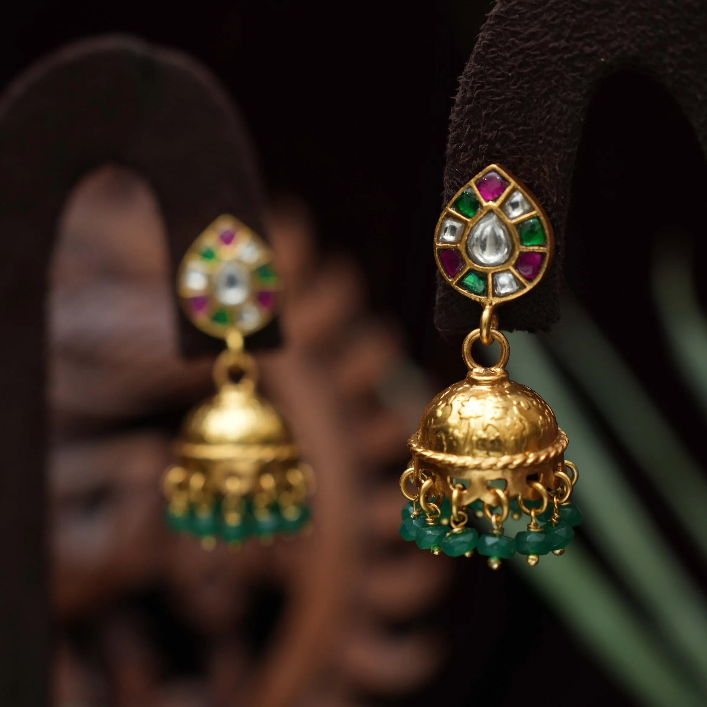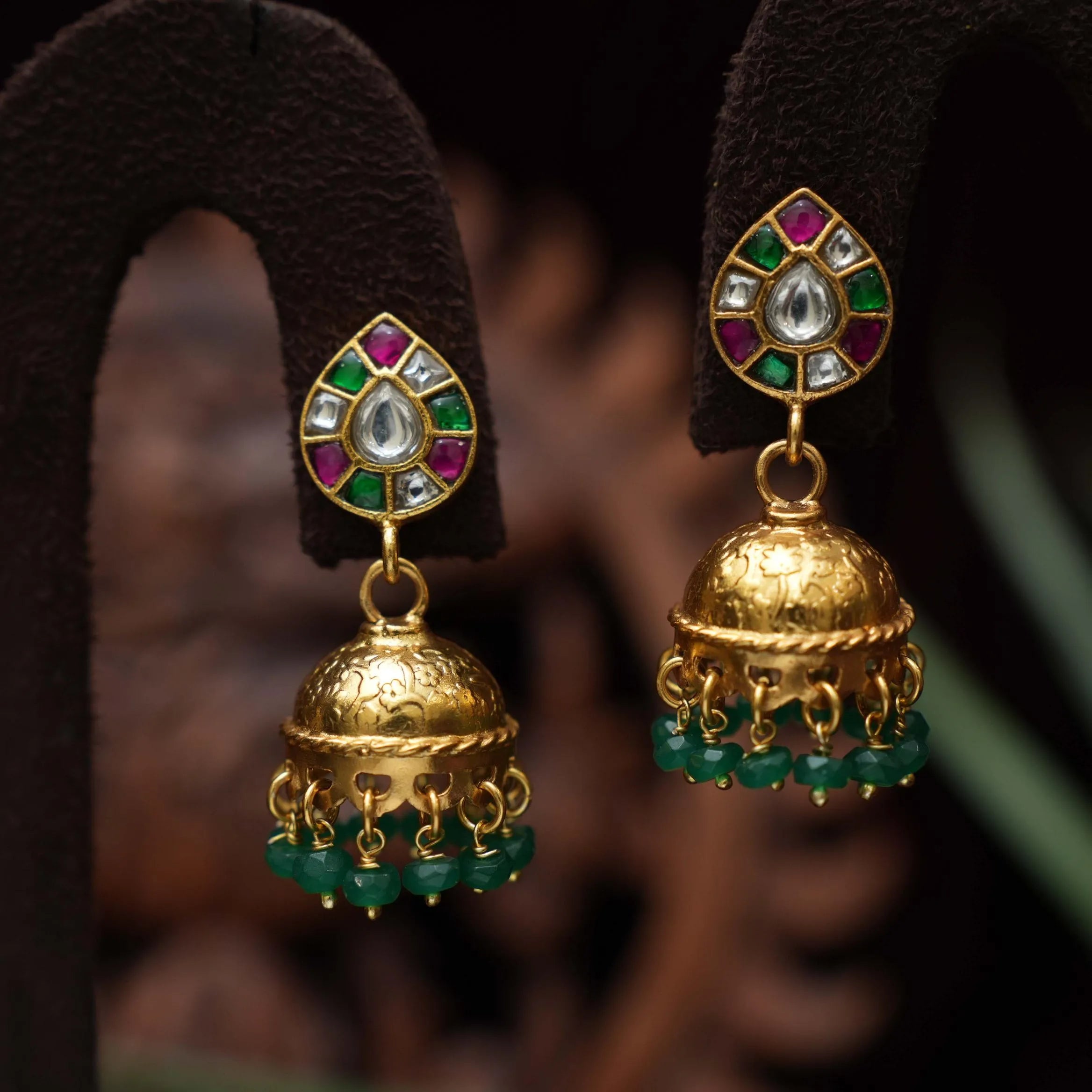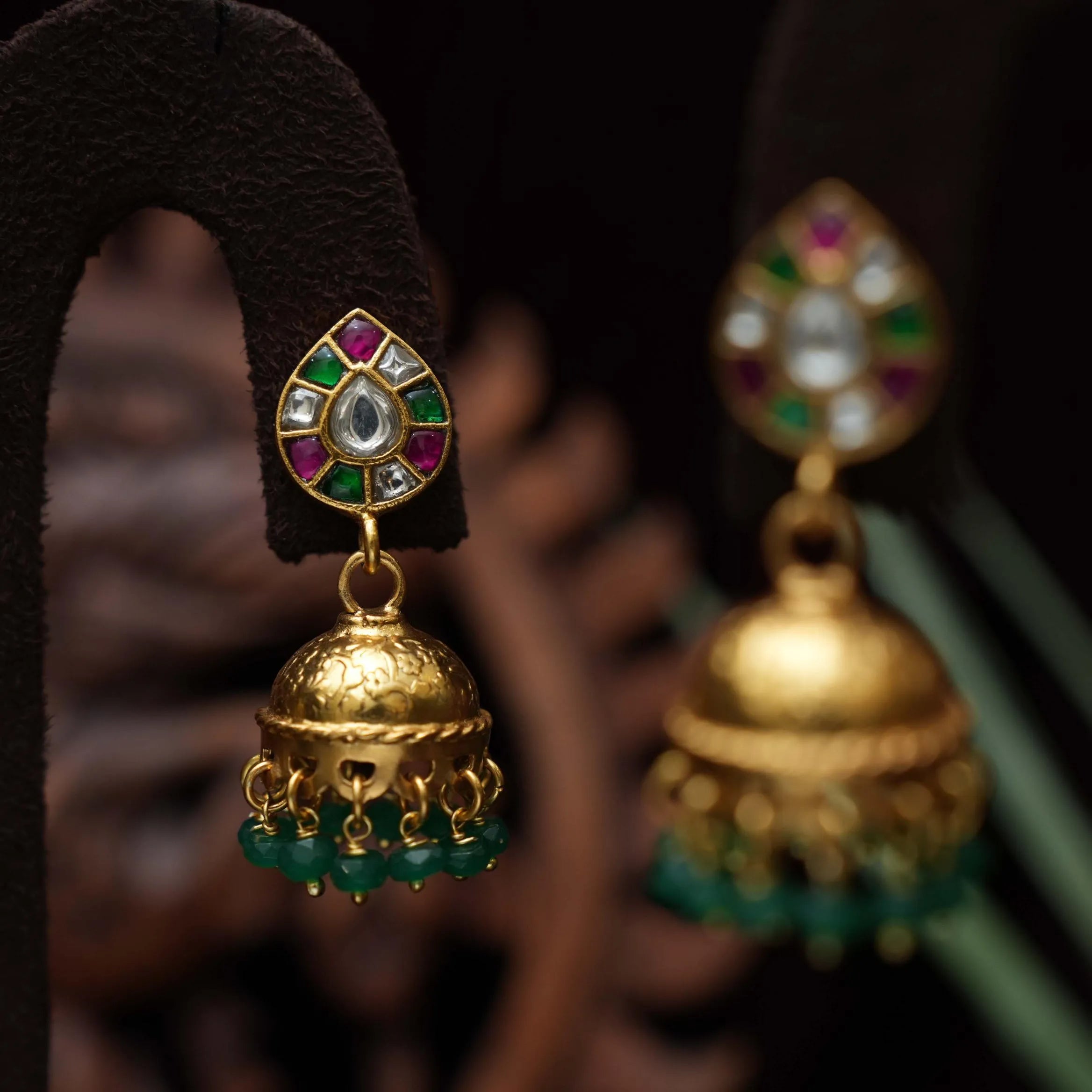 An elegant silver jhumka earrings studded with multicolor stones adorn with green beads.