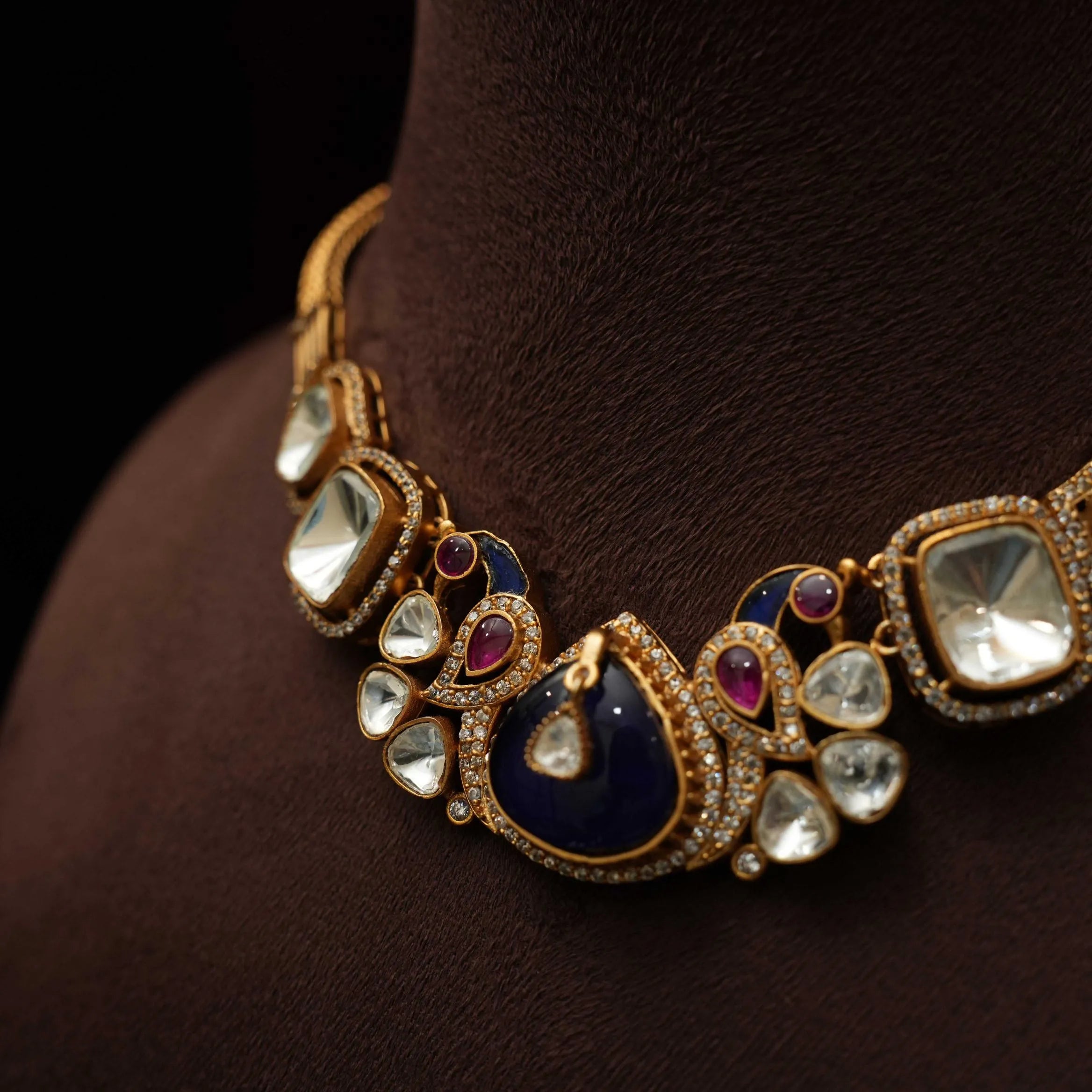 A beautiful necklace in peacock motif handcrafted with polki stones and agates. This set comes with a pair of earrings.