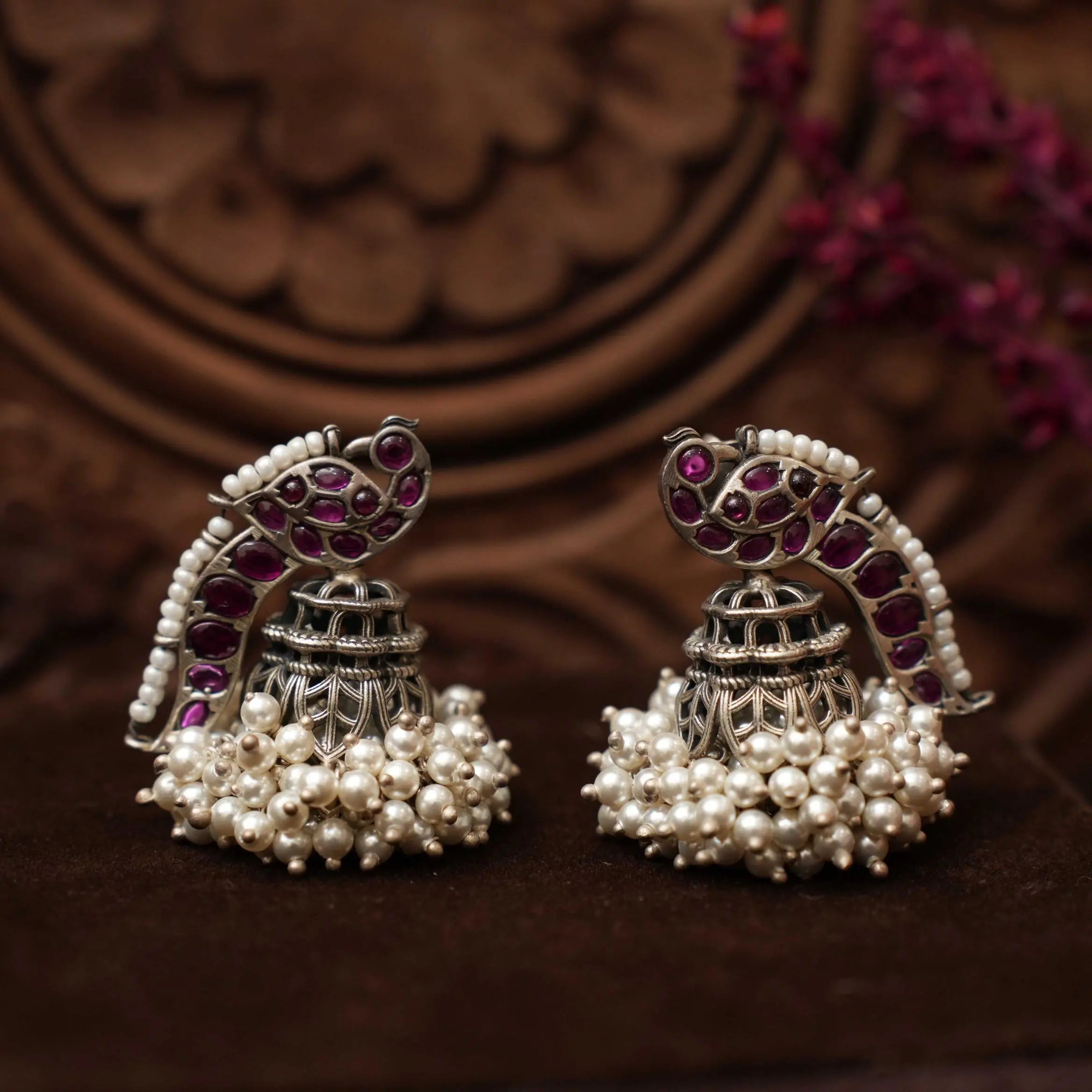 Captivate with a beautiful silver jhumka featuring intricate peacock motifs, adorned with vibrant kemp stones and lustrous pearls. This piece exudes charm, blending tradition and elegance effortlessly.