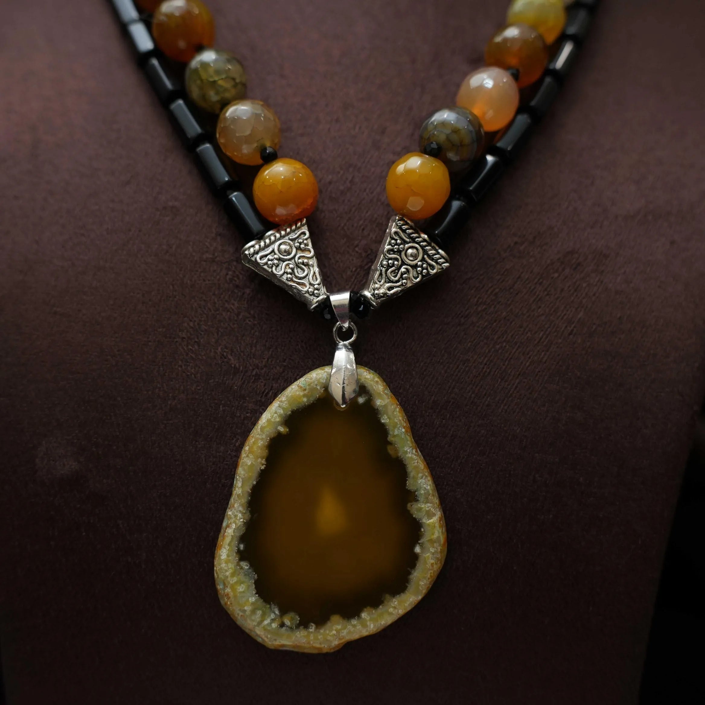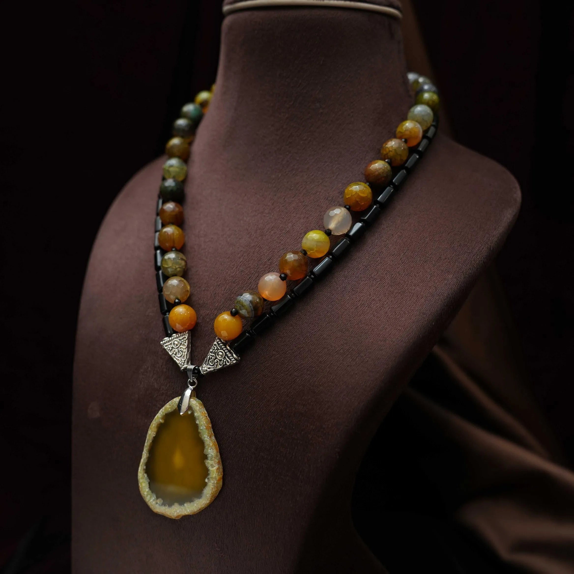 A classic layered necklace handcrafted in black and multicolor beads paired to orange shaded agate.