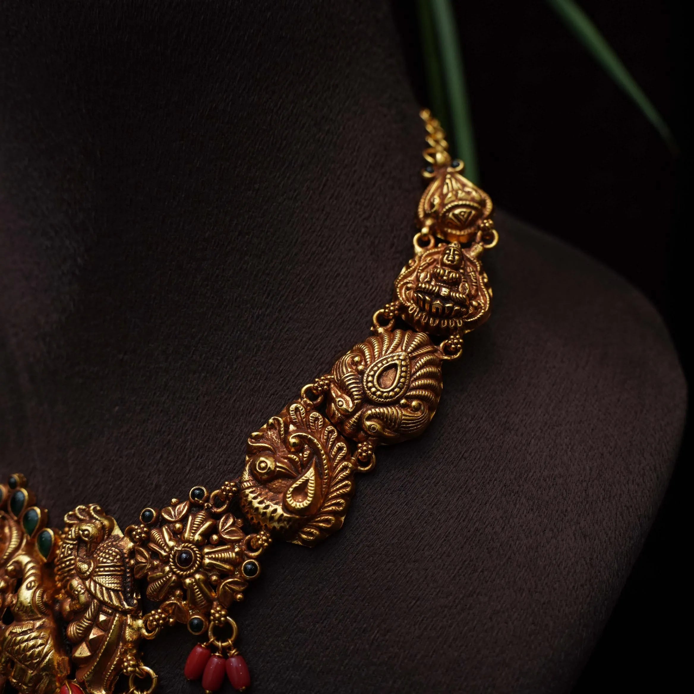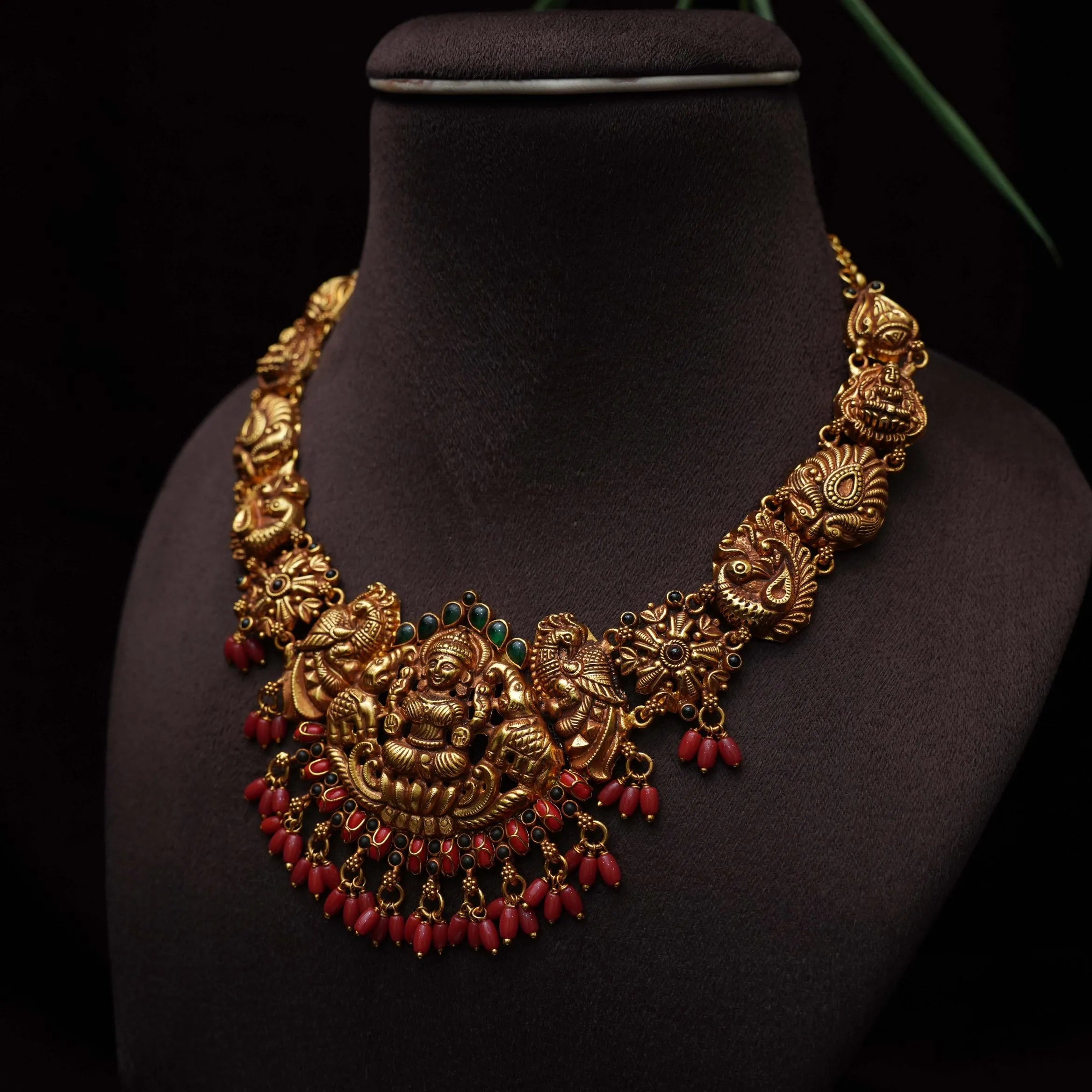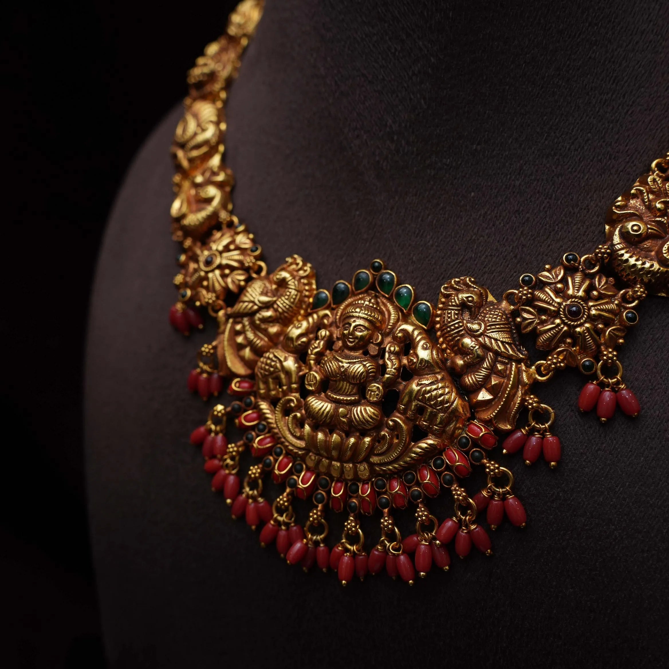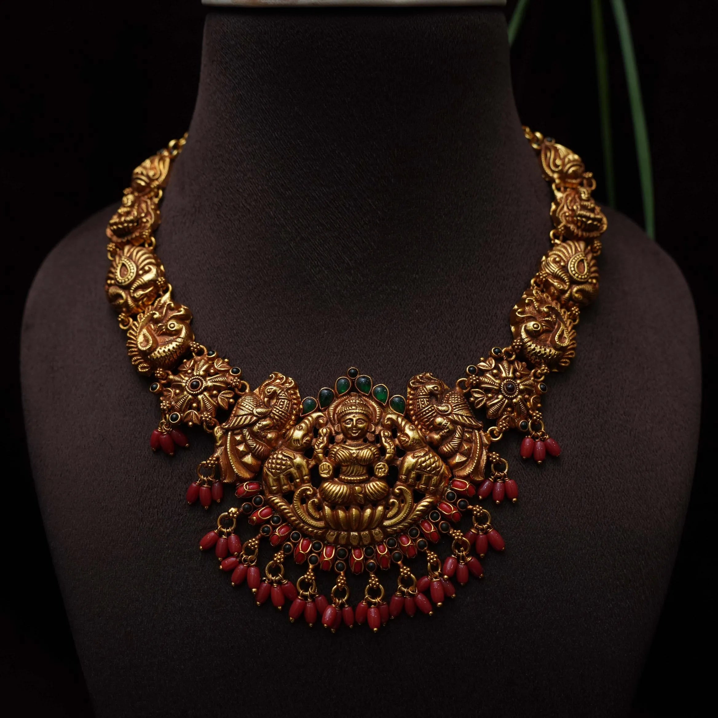A statement & traditional silver necklace in Goddess Lakshmi & peacock Motifs highlighted by coral beads & finished in Nagas finish.