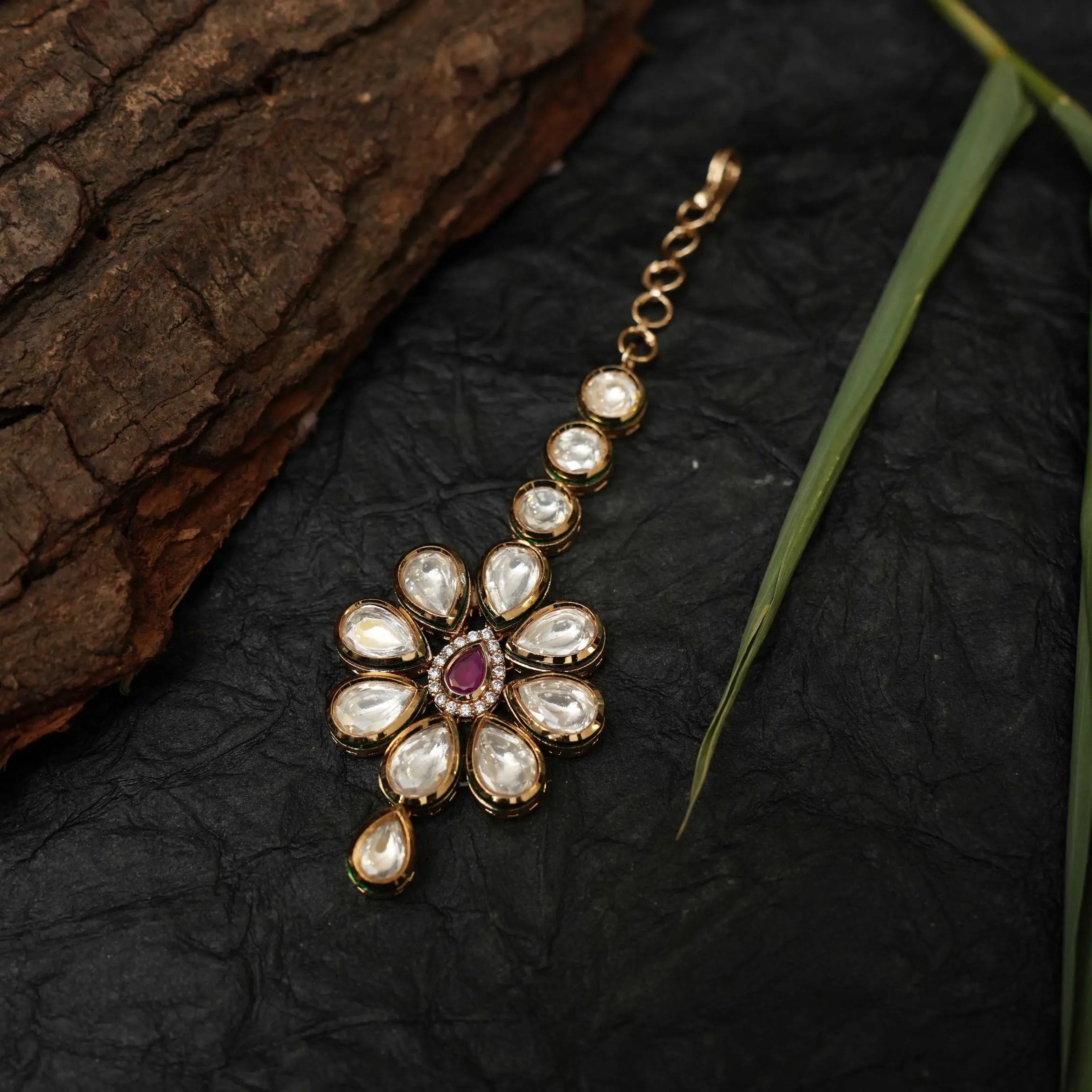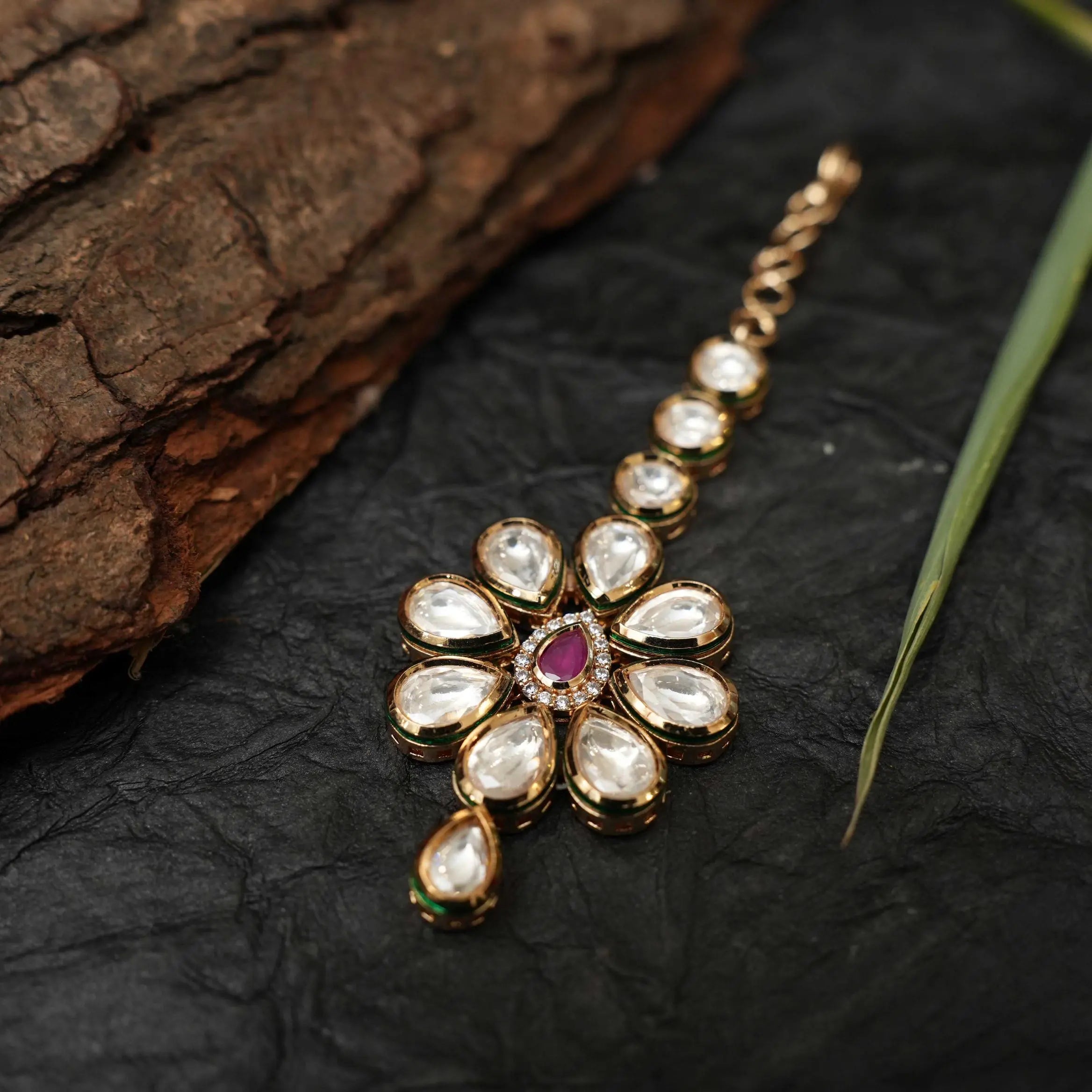 A beautiful and statement tikka handcrafted in floral motif studded with kundan stones.