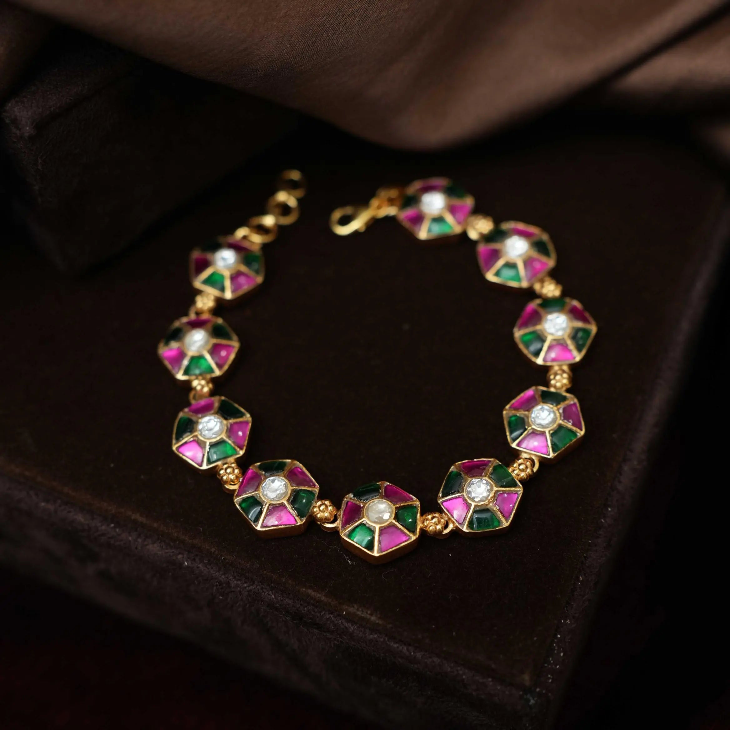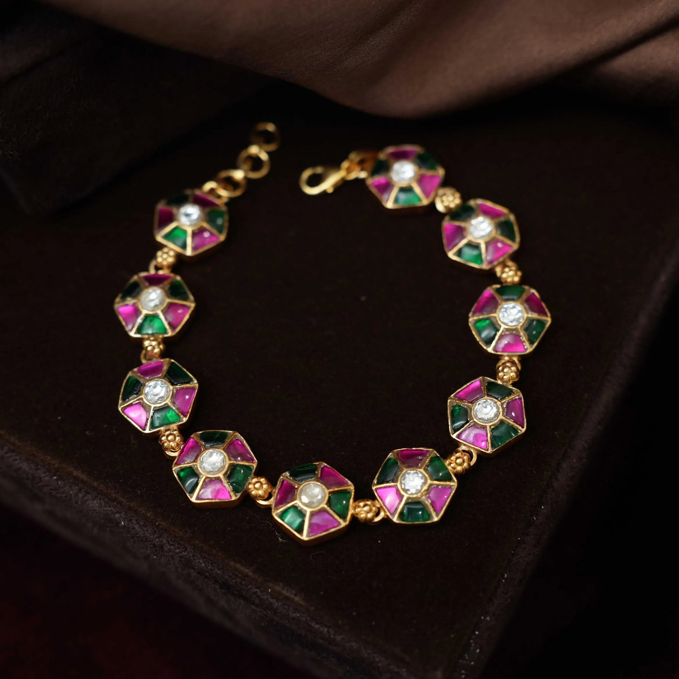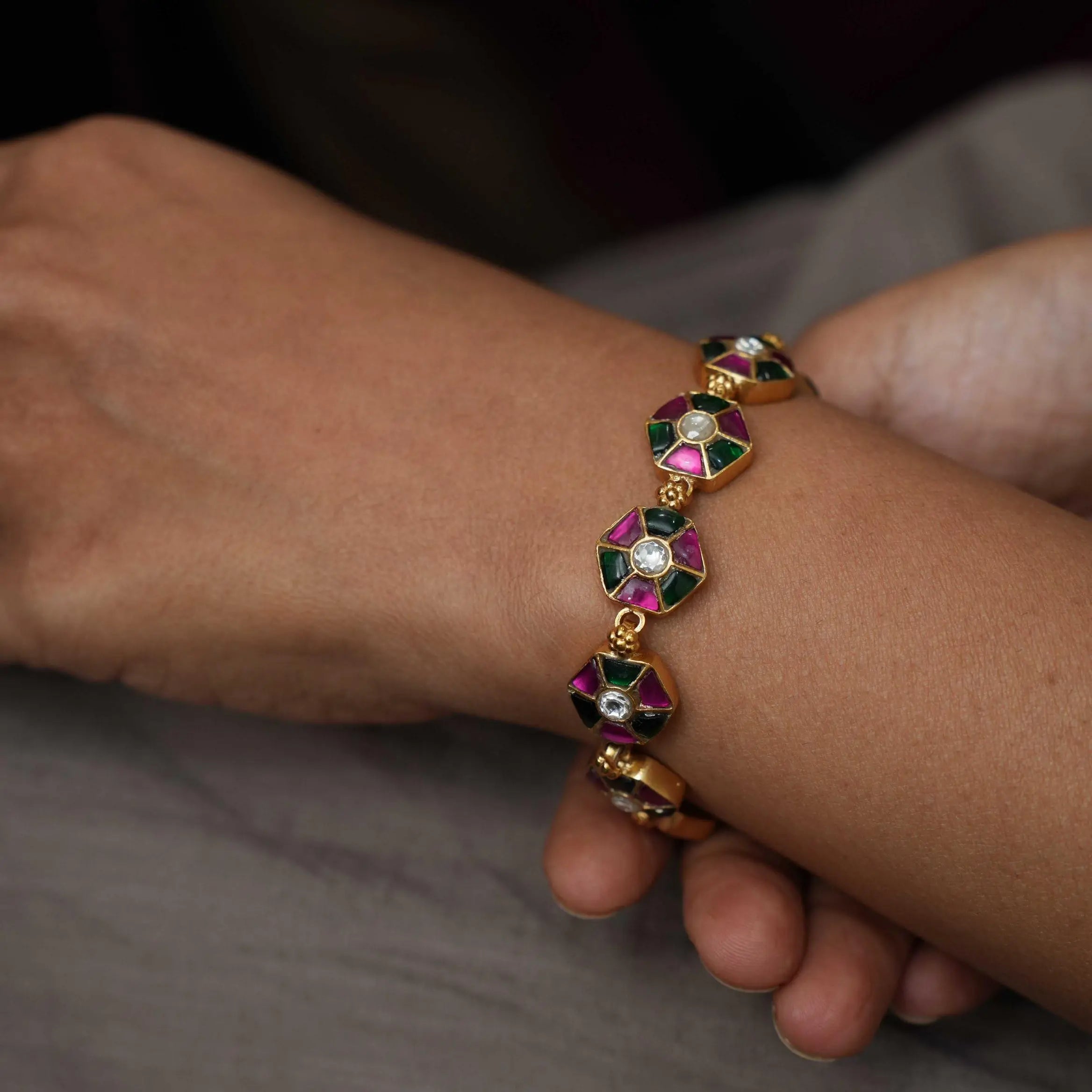 An elegant silver bracelet handcrafted in geometrical motif studded with multicolor stones.